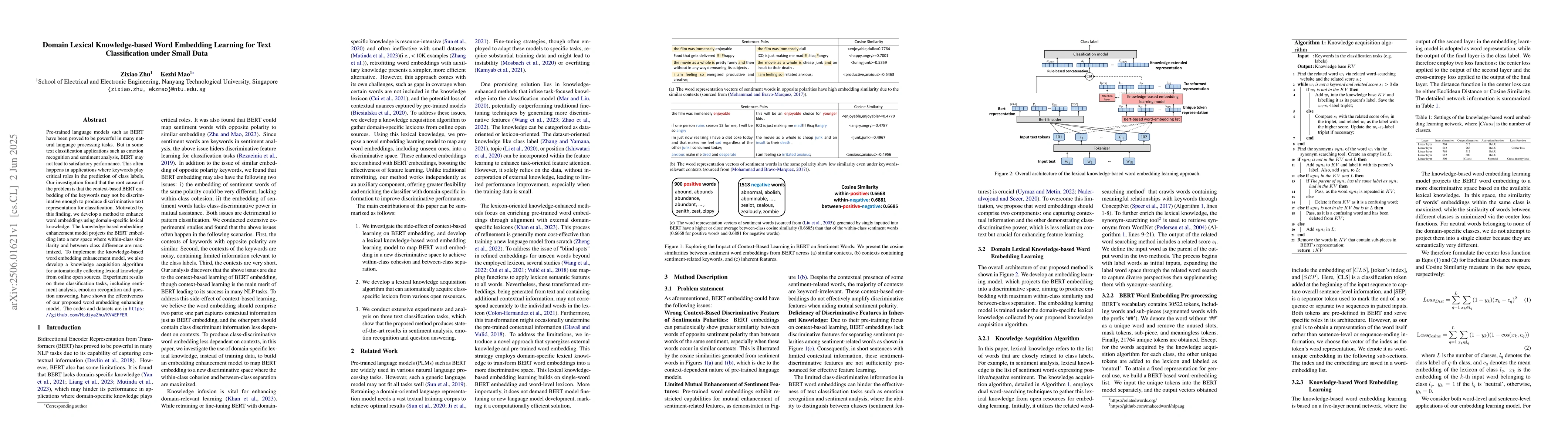 The paper introduces a knowledge acquisition algorithm for automatically collecting lexical knowledge and a knowledge-based word embedding enhancement model that improves classification performance by maximizing within-class similarity and between-class difference in the embedding space.