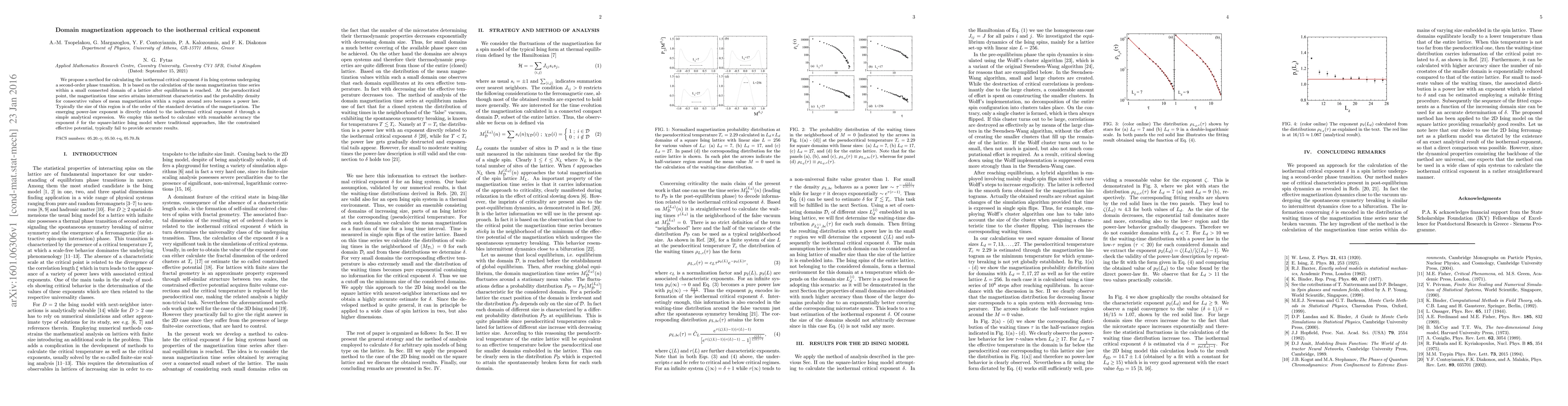 We propose a method for calculating the isothermal critical exponent $\delta$ in Ising systems undergoing a second-order phase transition. It is based on the calculation of the mean magnetization time series within a small connected domain of a lattice after equilibrium is reached. At the pseudocritical point, the magnetization time series attains intermittent characteristics and the probability density for consecutive values of mean magnetization within a region around zero becomes a power law. Typically the size of this region is of the order of the standard deviation of the magnetization. The emerging power-law exponent is directly related to the isothermal critical exponent $\delta$ through a simple analytical expression. We employ this method to calculate with remarkable accuracy the exponent $\delta$ for the square-lattice Ising model where traditional approaches, like the constrained effective potential, typically fail to provide accurate results.