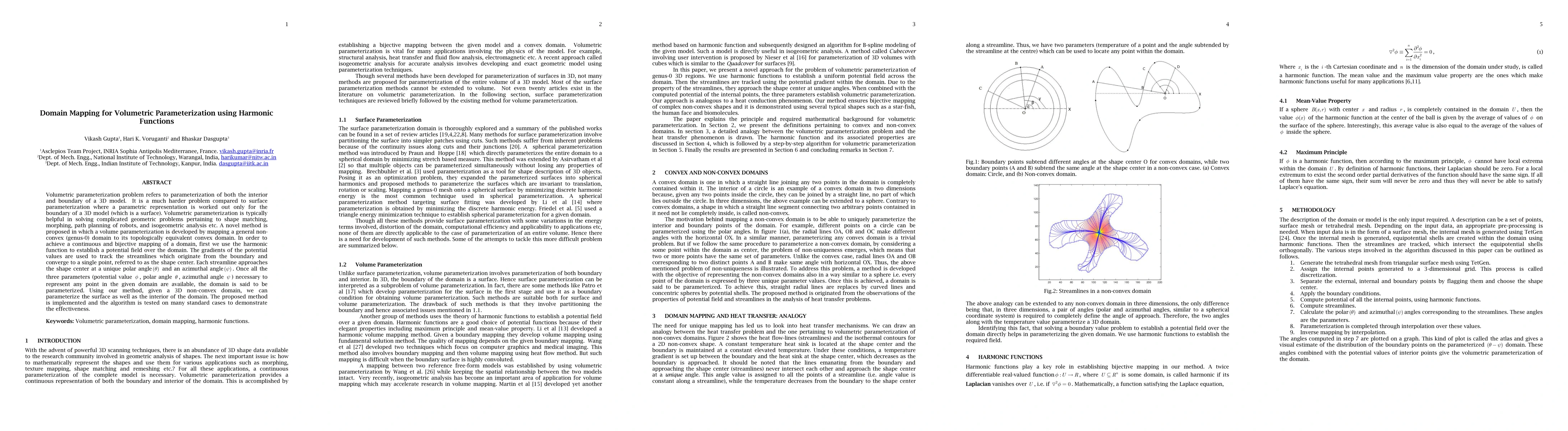 This paper proposes a novel method for volumetric parameterization of 3D non-convex domains by mapping them to convex domains using harmonic functions. The method establishes a potential field and tracks streamlines to a shape center, enabling continuous and bijective domain mapping.