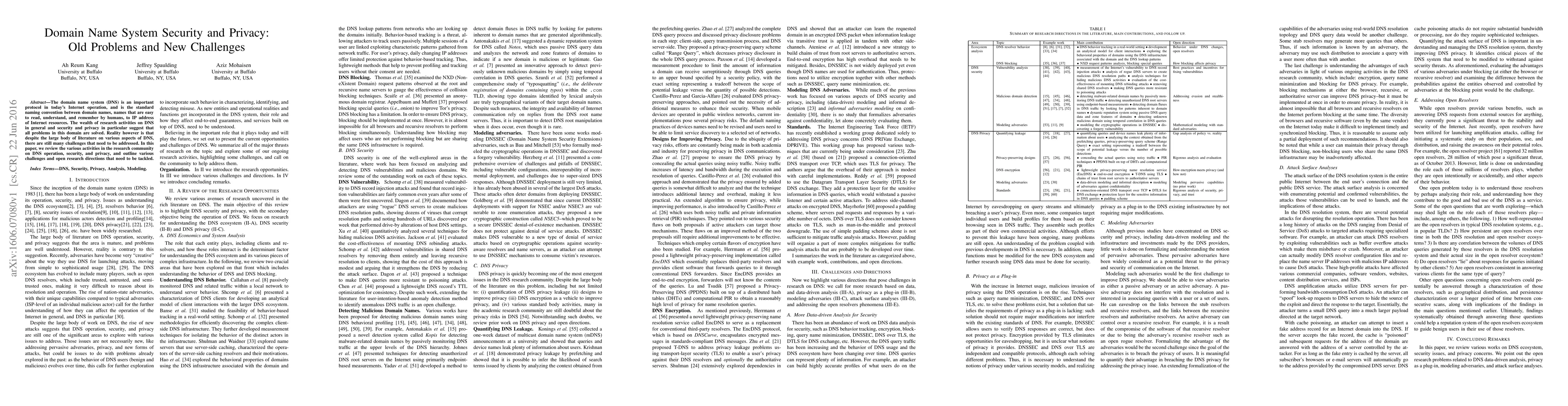 This paper reviews ongoing research on the Domain Name System (DNS), highlighting its critical role in internet operations, and identifies existing security and privacy challenges despite extensive literature. It outlines new challenges and open research directions that need to be addressed to enhance DNS security and privacy.