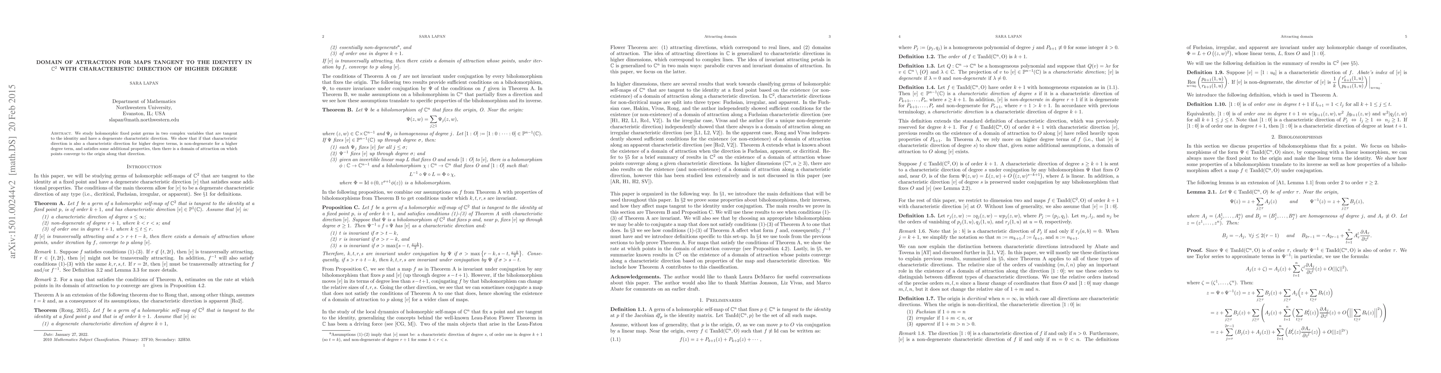 We study holomorphic fixed point germs in two complex variables that are tangent to the identity and have a degenerate characteristic direction. We show that if that characteristic direction is also a characteristic direction for higher degree terms, is non-degenerate for a higher degree term, and satisfies some additional properties, then there is a domain of attraction on which points converge to the origin along that direction.