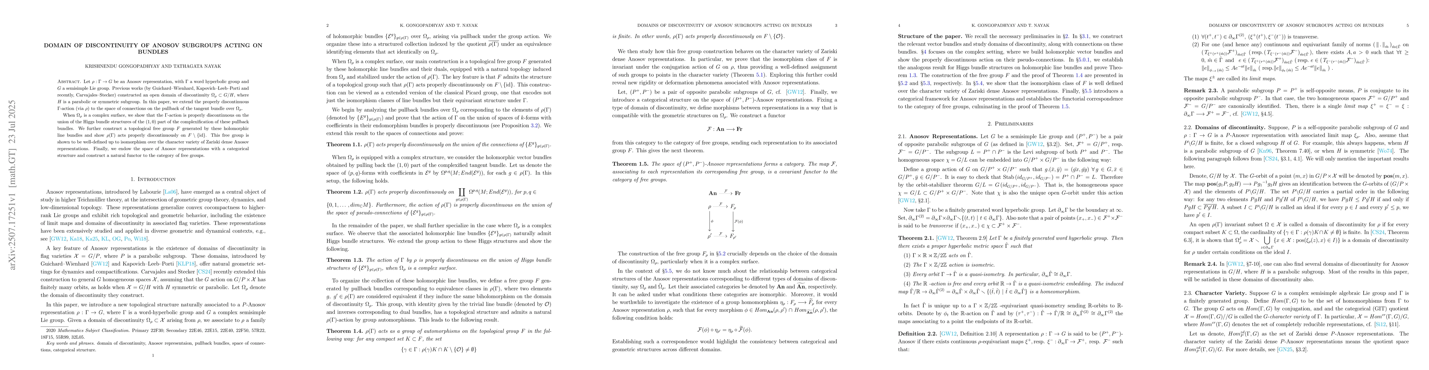 Let $\rho: \Gamma \to G$ be an Anosov representation, with $\Gamma$ a word hyperbolic group and $G$ a semisimple Lie group. Previous works (by Guichard--Wienhard, Kapovich--Leeb--Porti, and recently Carvajales--Stecker) constructed an open domain of discontinuity $\Omega_\rho \subset G/H$, where $H$ is a parabolic or symmetric subgroup. In this paper, we extend the properly discontinuous $\Gamma$-action (via $\rho$) to the space of connections on the pullback of the tangent bundle over $\Omega_\rho$. When $\Omega_\rho$ is a complex surface, we show that the $\Gamma$-action is properly discontinuous on the union of the Higgs bundle structures of the $(1,0)$ part of the complexification of these pullback bundles. We further construct a topological free group $F$ generated by these holomorphic line bundles and show that $\rho(\Gamma)$ acts properly discontinuously on $F \setminus \{\mathrm{id}\}$. This free group is shown to be well-defined up to isomorphism over the character variety of Zariski dense Anosov representations. Finally, we endow the space of Anosov representations with a categorical structure and construct a natural functor to the category of free groups.