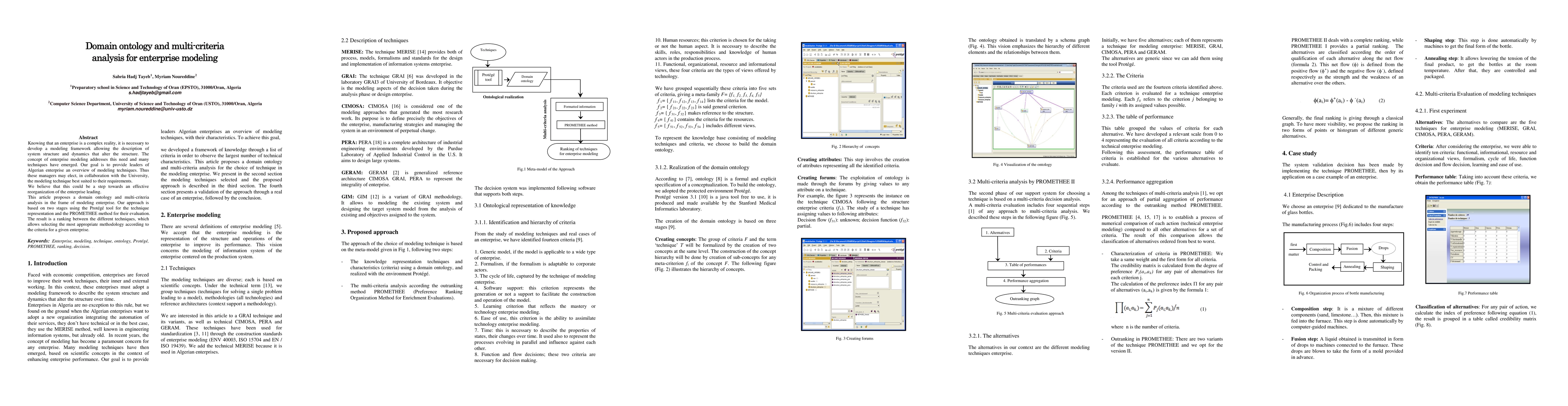 This paper proposes a domain ontology and multi-criteria analysis framework for enterprise modeling, using Protégé for technique representation and PROMETHEE for evaluation. The goal is to help Algerian enterprise leaders select the most suitable modeling technique for effective reorganization.