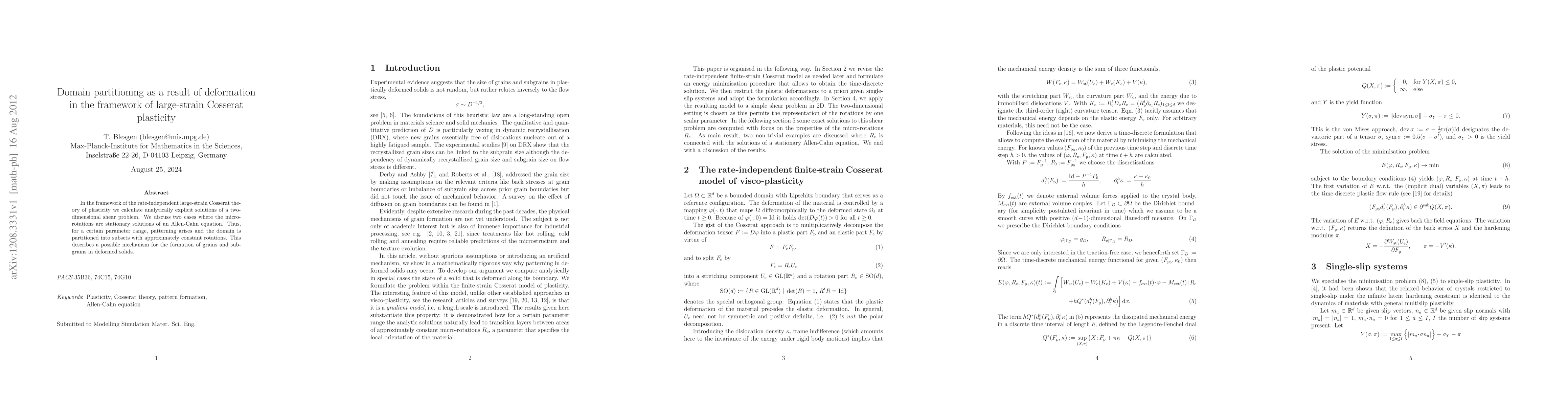 This research presents analytical solutions for a 2D shear problem in large-strain Cosserat plasticity, demonstrating domain partitioning due to micro-rotation stationarity in Allen-Cahn equations. This mechanism explains grain and subgrain formation in deformed solids.