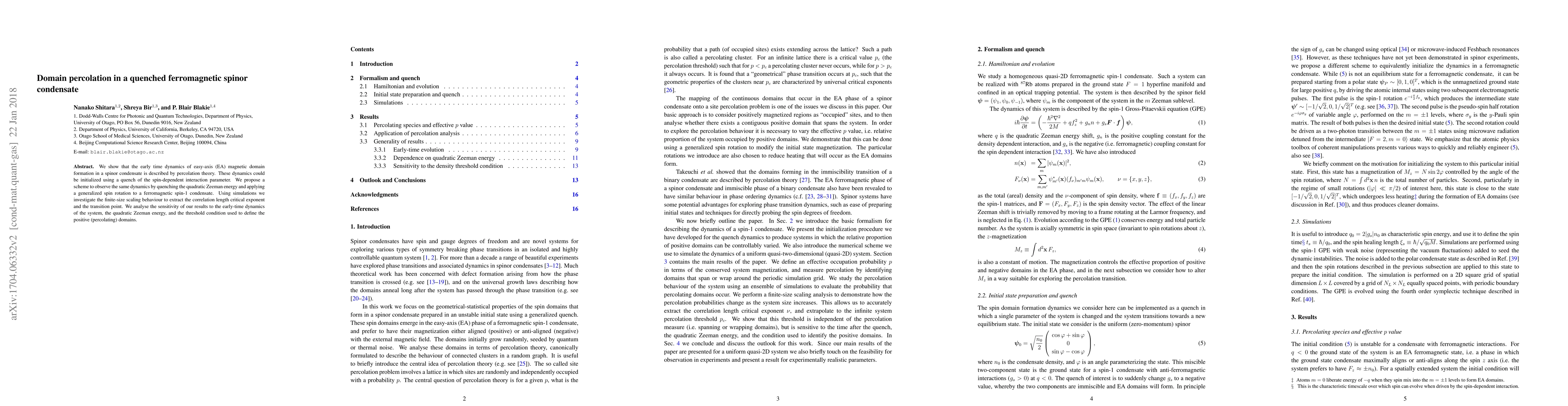 This paper demonstrates that magnetic domains in a quenched ferromagnetic spinor condensate follow percolation theory, using simulations to study their finite-size scaling behavior and extract critical exponents and transition points. The study also examines the impact of early-time dynamics, quadratic Zeeman energy, and domain definition thresholds on the results.