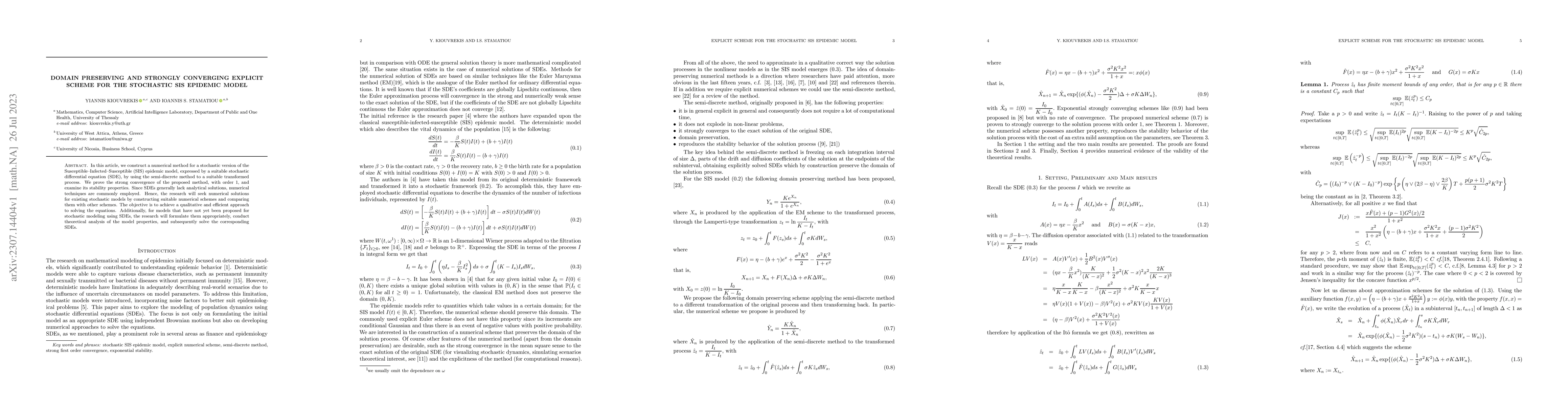 In this article, we construct a numerical method for a stochastic version of the Susceptible Infected Susceptible (SIS) epidemic model, expressed by a suitable stochastic differential equation (SDE), by using the semi-discrete method to a suitable transformed process. We prove the strong convergence of the proposed method, with order $1,$ and examine its stability properties. Since SDEs generally lack analytical solutions, numerical techniques are commonly employed. Hence, the research will seek numerical solutions for existing stochastic models by constructing suitable numerical schemes and comparing them with other schemes. The objective is to achieve a qualitative and efficient approach to solving the equations. Additionally, for models that have not yet been proposed for stochastic modeling using SDEs, the research will formulate them appropriately, conduct theoretical analysis of the model properties, and subsequently solve the corresponding SDEs.