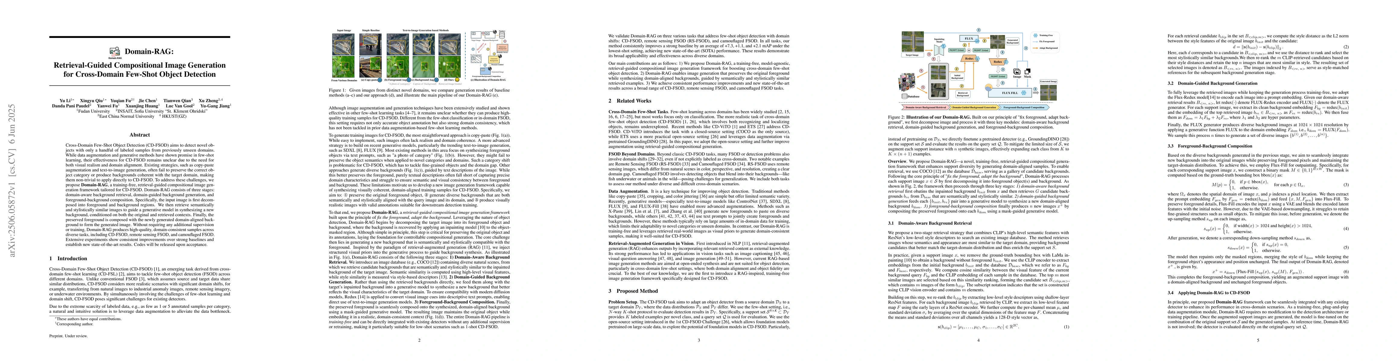 Cross-Domain Few-Shot Object Detection (CD-FSOD) aims to detect novel objects with only a handful of labeled samples from previously unseen domains. While data augmentation and generative methods have shown promise in few-shot learning, their effectiveness for CD-FSOD remains unclear due to the need for both visual realism and domain alignment. Existing strategies, such as copy-paste augmentation and text-to-image generation, often fail to preserve the correct object category or produce backgrounds coherent with the target domain, making them non-trivial to apply directly to CD-FSOD. To address these challenges, we propose Domain-RAG, a training-free, retrieval-guided compositional image generation framework tailored for CD-FSOD. Domain-RAG consists of three stages: domain-aware background retrieval, domain-guided background generation, and foreground-background composition. Specifically, the input image is first decomposed into foreground and background regions. We then retrieve semantically and stylistically similar images to guide a generative model in synthesizing a new background, conditioned on both the original and retrieved contexts. Finally, the preserved foreground is composed with the newly generated domain-aligned background to form the generated image. Without requiring any additional supervision or training, Domain-RAG produces high-quality, domain-consistent samples across diverse tasks, including CD-FSOD, remote sensing FSOD, and camouflaged FSOD. Extensive experiments show consistent improvements over strong baselines and establish new state-of-the-art results. Codes will be released upon acceptance.