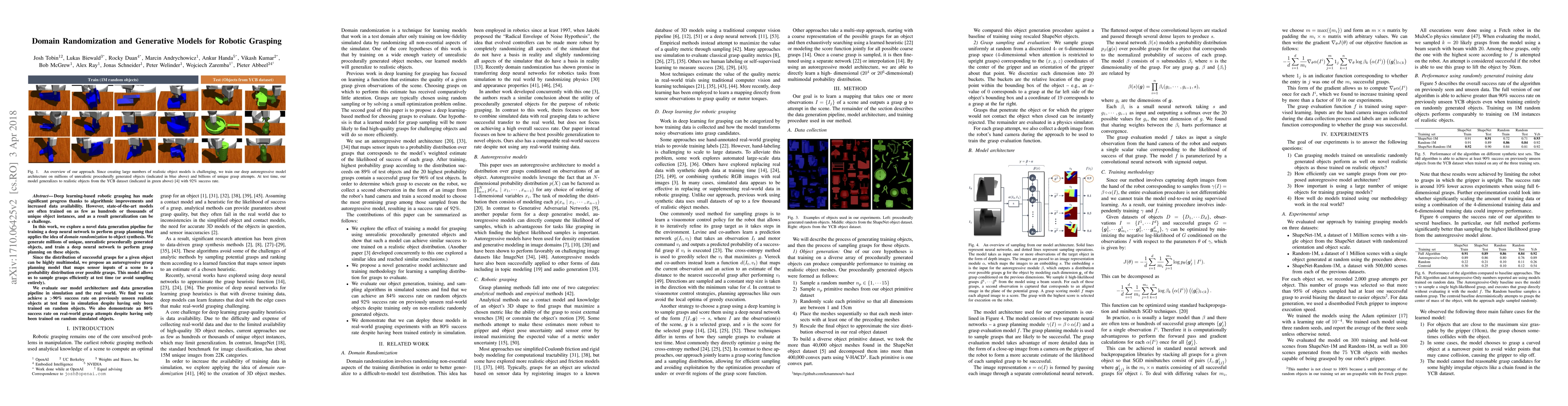 Deep learning-based robotic grasping has made significant progress thanks to algorithmic improvements and increased data availability. However, state-of-the-art models are often trained on as few as hundreds or thousands of unique object instances, and as a result generalization can be a challenge. In this work, we explore a novel data generation pipeline for training a deep neural network to perform grasp planning that applies the idea of domain randomization to object synthesis. We generate millions of unique, unrealistic procedurally generated objects, and train a deep neural network to perform grasp planning on these objects. Since the distribution of successful grasps for a given object can be highly multimodal, we propose an autoregressive grasp planning model that maps sensor inputs of a scene to a probability distribution over possible grasps. This model allows us to sample grasps efficiently at test time (or avoid sampling entirely). We evaluate our model architecture and data generation pipeline in simulation and the real world. We find we can achieve a $>$90% success rate on previously unseen realistic objects at test time in simulation despite having only been trained on random objects. We also demonstrate an 80% success rate on real-world grasp attempts despite having only been trained on random simulated objects.