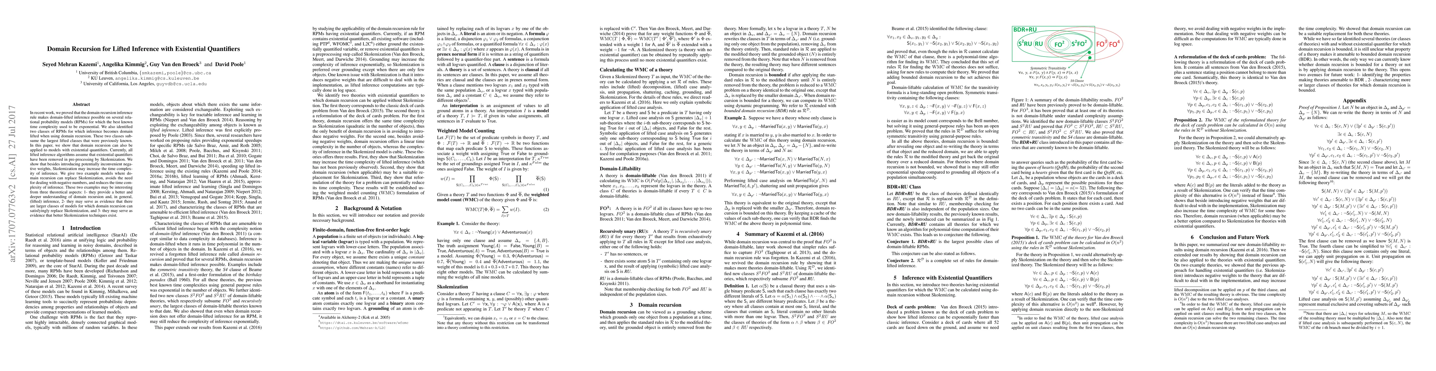 This paper extends domain recursion to models with existential quantifiers, reducing time complexity and avoiding negative weights in inference, and providing new insights into lifted inference.