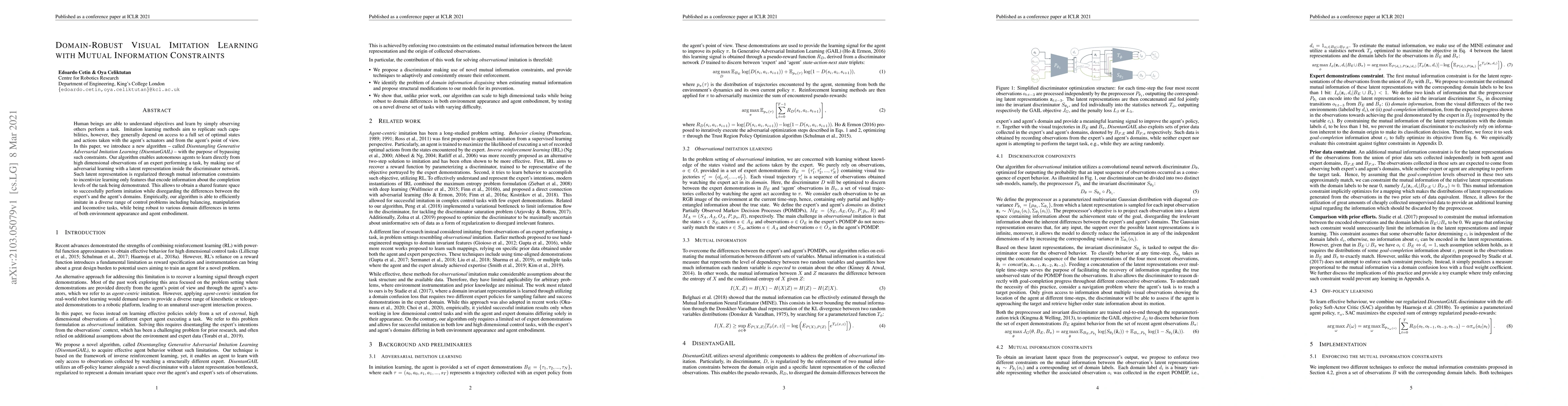 This paper proposes DisentanGAIL, an imitation learning algorithm that leverages adversarial learning and mutual information constraints to enable agents to learn directly from high-dimensional expert observations without needing optimal states and actions. The method is robust to domain differences and successfully imitates a variety of control tasks.