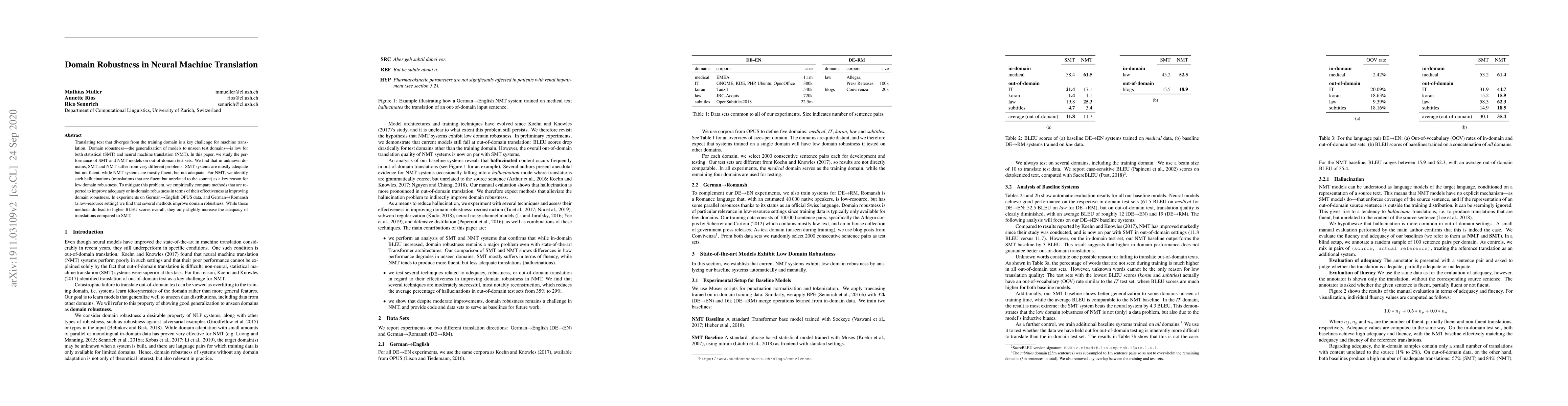 This paper investigates the domain robustness of statistical and neural machine translation models, finding that neural models struggle with "hallucinations" in unseen domains, while statistical models are adequate but lack fluency. Experiments show that certain methods can improve domain robustness but only marginally enhance the adequacy of neural translations compared to statistical models.