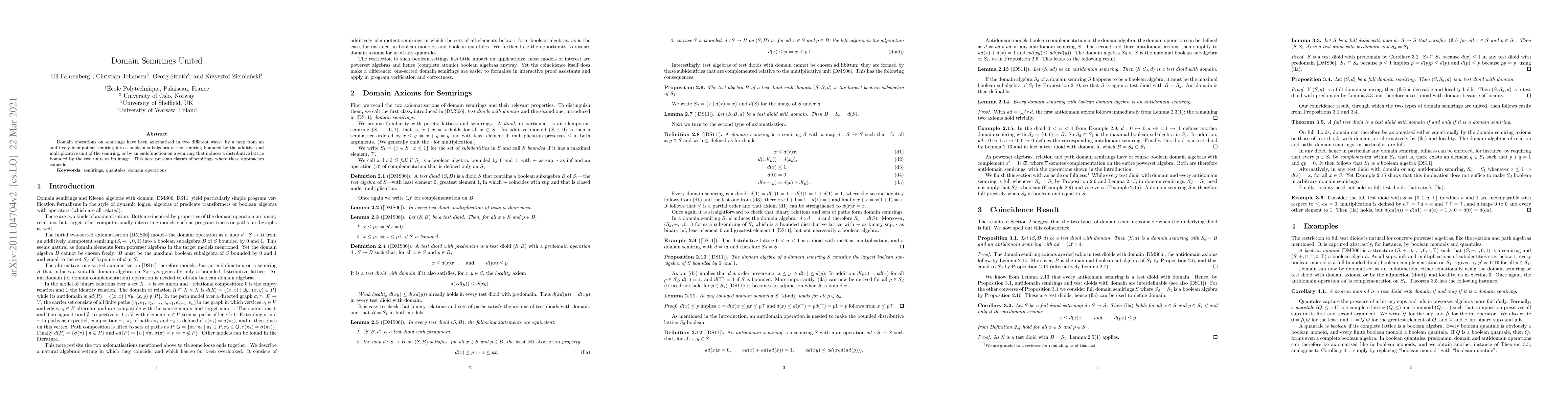 This paper explores the equivalence of two axiomatizations of domain operations on semirings: one via a map into a bounded boolean subalgebra, and the other through an endofunction inducing a distributive lattice. It identifies classes of semirings where these two approaches yield the same results.