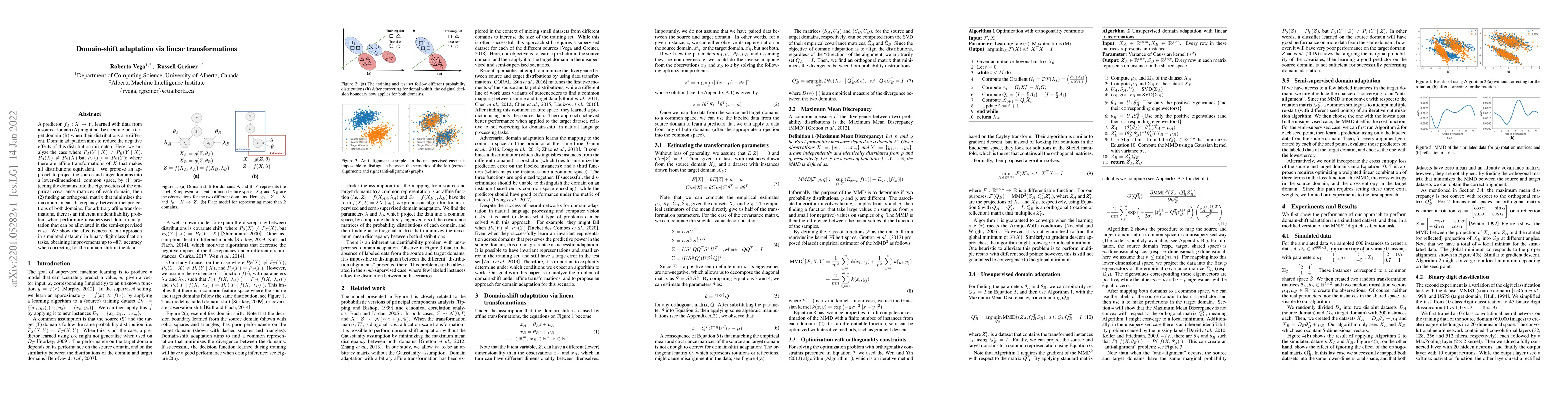 A predictor, $f_A : X \to Y$, learned with data from a source domain (A) might not be accurate on a target domain (B) when their distributions are different. Domain adaptation aims to reduce the negative effects of this distribution mismatch. Here, we analyze the case where $P_A(Y\ |\ X) \neq P_B(Y\ |\ X)$, $P_A(X) \neq P_B(X)$ but $P_A(Y) = P_B(Y)$; where there are affine transformations of $X$ that makes all distributions equivalent. We propose an approach to project the source and target domains into a lower-dimensional, common space, by (1) projecting the domains into the eigenvectors of the empirical covariance matrices of each domain, then (2) finding an orthogonal matrix that minimizes the maximum mean discrepancy between the projections of both domains. For arbitrary affine transformations, there is an inherent unidentifiability problem when performing unsupervised domain adaptation that can be alleviated in the semi-supervised case. We show the effectiveness of our approach in simulated data and in binary digit classification tasks, obtaining improvements up to 48% accuracy when correcting for the domain shift in the data.