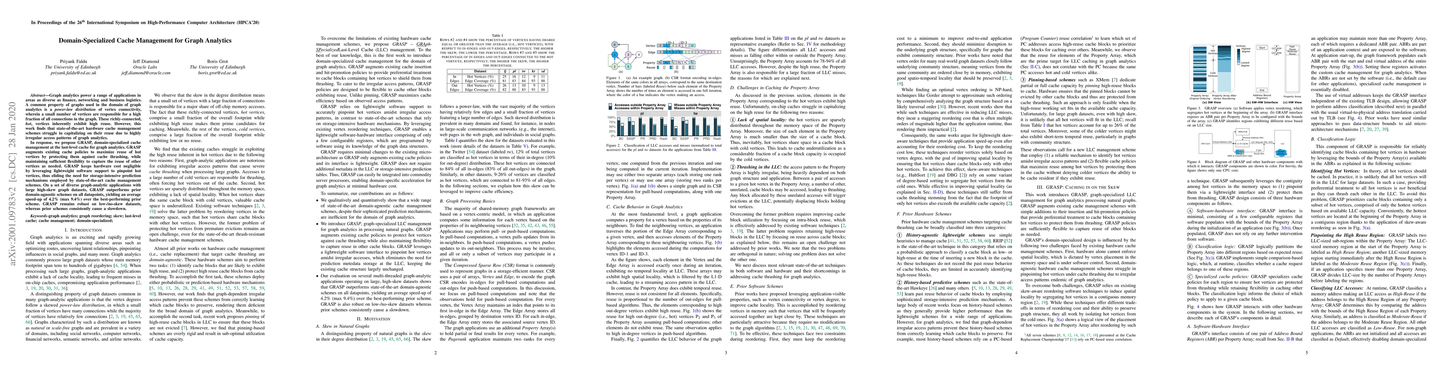 Graph analytics power a range of applications in areas as diverse as finance, networking and business logistics. A common property of graphs used in the domain of graph analytics is a power-law distribution of vertex connectivity, wherein a small number of vertices are responsible for a high fraction of all connections in the graph. These richly-connected, hot, vertices inherently exhibit high reuse. However, this work finds that state-of-the-art hardware cache management schemes struggle in capitalizing on their reuse due to highly irregular access patterns of graph analytics. In response, we propose GRASP, domain-specialized cache management at the last-level cache for graph analytics. GRASP augments existing cache policies to maximize reuse of hot vertices by protecting them against cache thrashing, while maintaining sufficient flexibility to capture the reuse of other vertices as needed. GRASP keeps hardware cost negligible by leveraging lightweight software support to pinpoint hot vertices, thus eliding the need for storage-intensive prediction mechanisms employed by state-of-the-art cache management schemes. On a set of diverse graph-analytic applications with large high-skew graph datasets, GRASP outperforms prior domain-agnostic schemes on all datapoints, yielding an average speed-up of 4.2% (max 9.4%) over the best-performing prior scheme. GRASP remains robust on low-/no-skew datasets, whereas prior schemes consistently cause a slowdown.