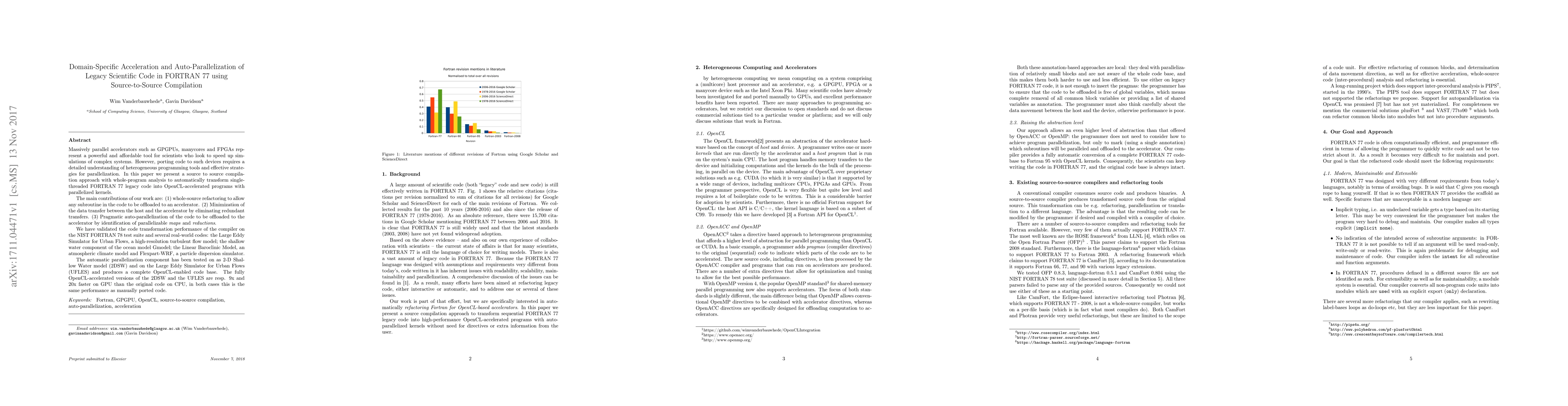 This paper presents a source-to-source compilation technique for automatically transforming single-threaded FORTRAN 77 legacy code into OpenCL-accelerated parallel programs, enabling efficient execution on GPGPUs and other accelerators. The approach minimizes data transfer and pragmatically identifies parallelizable sections for acceleration.