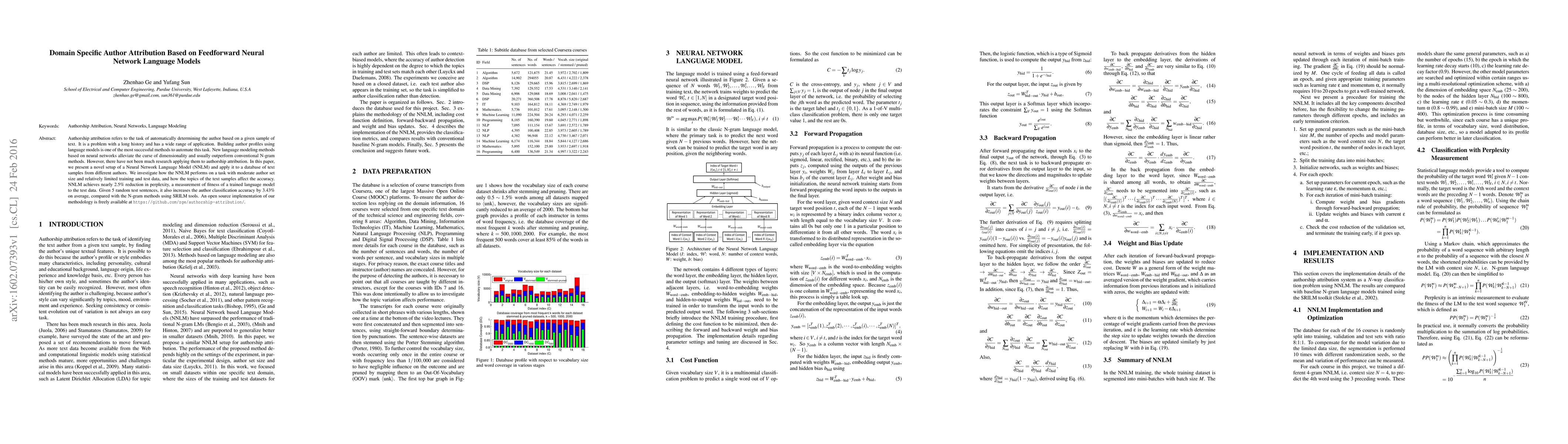This paper introduces a Neural Network Language Model (NNLM) for domain-specific author attribution, achieving a 2.5% reduction in perplexity and a 3.43% increase in classification accuracy compared to N-gram methods. The study highlights the effectiveness of NNLMs in handling limited training data and varied text topics.