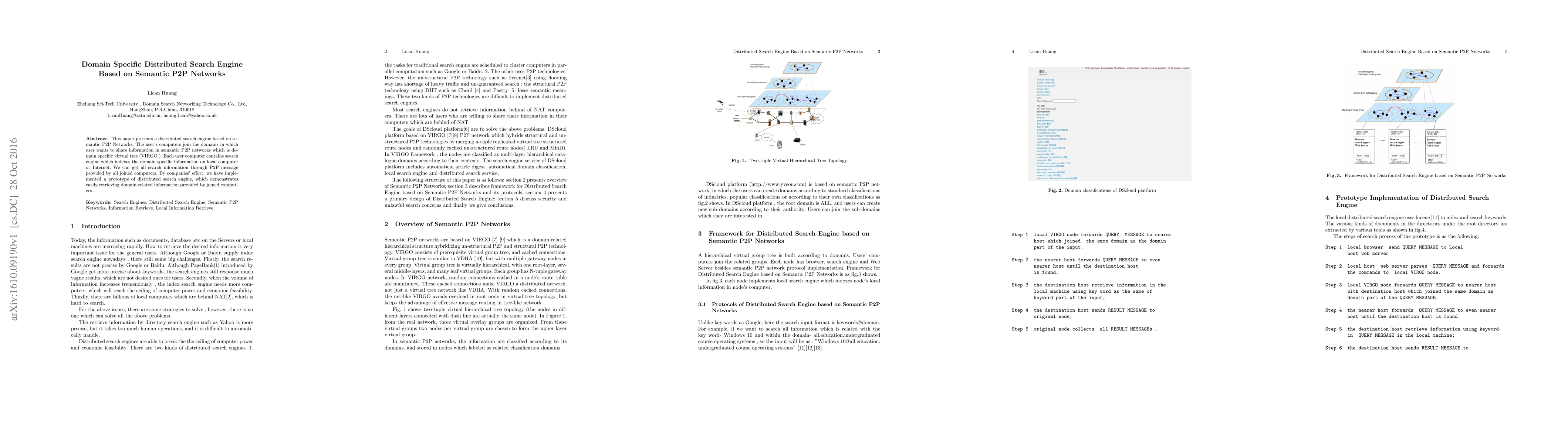 This paper introduces a domain-specific distributed search engine utilizing semantic P2P networks, where users' computers join domain-specific virtual trees (VIRGO) to share and index information. A prototype demonstrates effective retrieval of domain-related information from participating computers.