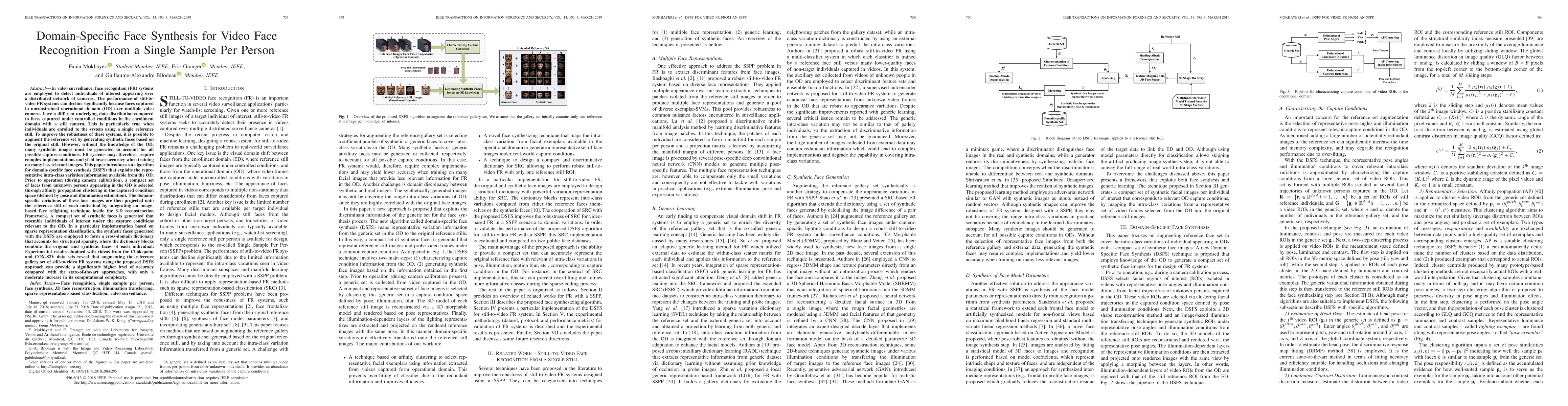 A new algorithm, domain-specific face synthesis, improves video face recognition accuracy by generating faces from a single reference image that match the operational domain conditions, outperforming state-of-the-art approaches with moderate increased complexity.
