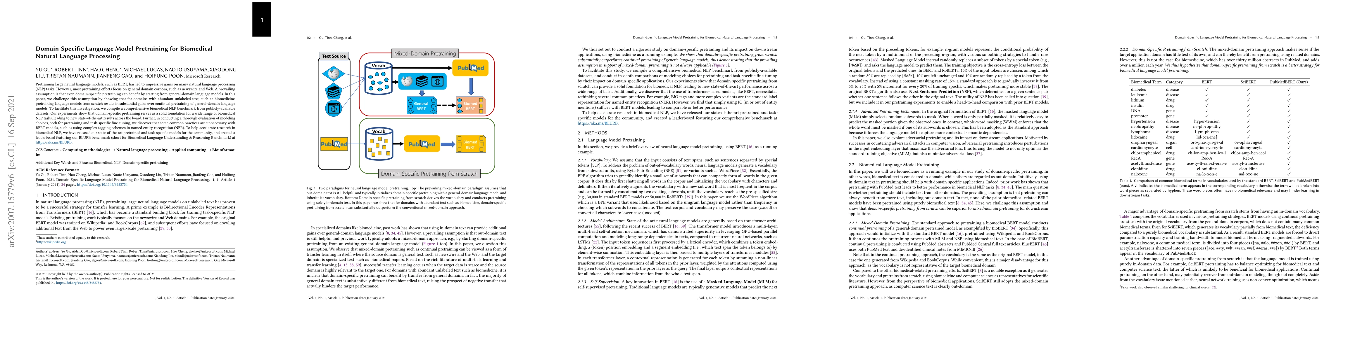 This paper investigates domain-specific pretraining for biomedical NLP, demonstrating that starting from scratch for abundant biomedical text outperforms continual pretraining from general-domain models. The authors achieve state-of-the-art results across various tasks and release their models and benchmark to advance biomedical NLP research.