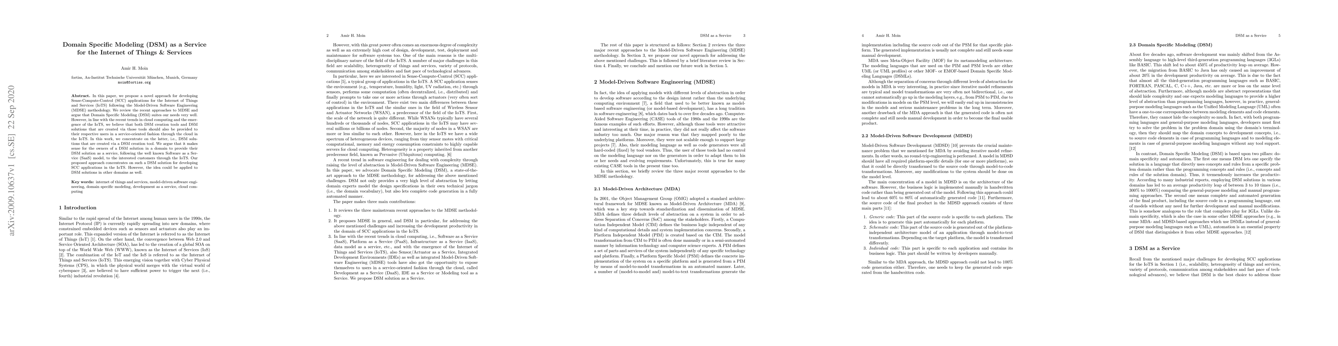 In this paper, we propose a novel approach for developing Sense-Compute-Control (SCC) applications for the Internet of Things and Services (IoTS) following the Model-Driven Software Engineering (MDSE) methodology. We review the recent approaches to MDSE and argue that Domain Specific Modeling (DSM) suites our needs very well. However, in line with the recent trends in cloud computing and the emer-gence of the IoTS, we believe that both DSM creation tools and DSM solutions that are created via those tools should also be provided to their respective users in a service-oriented fashion through the cloud in the IoTS. In this work, we concentrate on the latter, i.e., DSM solu-tions that are created via a DSM creation tool. We argue that it makes sense for the owners of a DSM solution in a domain to provide their DSM solution as a service, following the well known Software as a Ser-vice (SaaS) model, to the interested customers through the IoTS. Our proposed approach concentrates on such a DSM solution for developing SCC applications in the IoTS. However, the idea could be applied to DSM solutions in other domains as well.