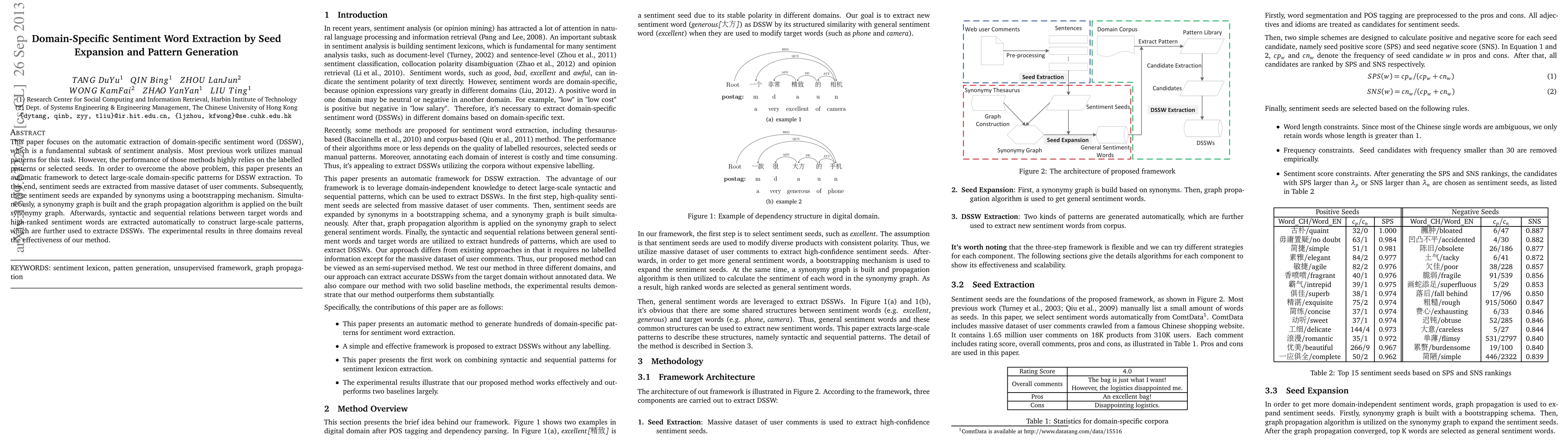 This paper presents an automatic framework for extracting domain-specific sentiment words (DSSW) using seed expansion and pattern generation, overcoming reliance on manual patterns. It utilizes sentiment seeds from user comments, expands them via synonyms, and constructs patterns for DSSW extraction, demonstrating effectiveness across three domains.