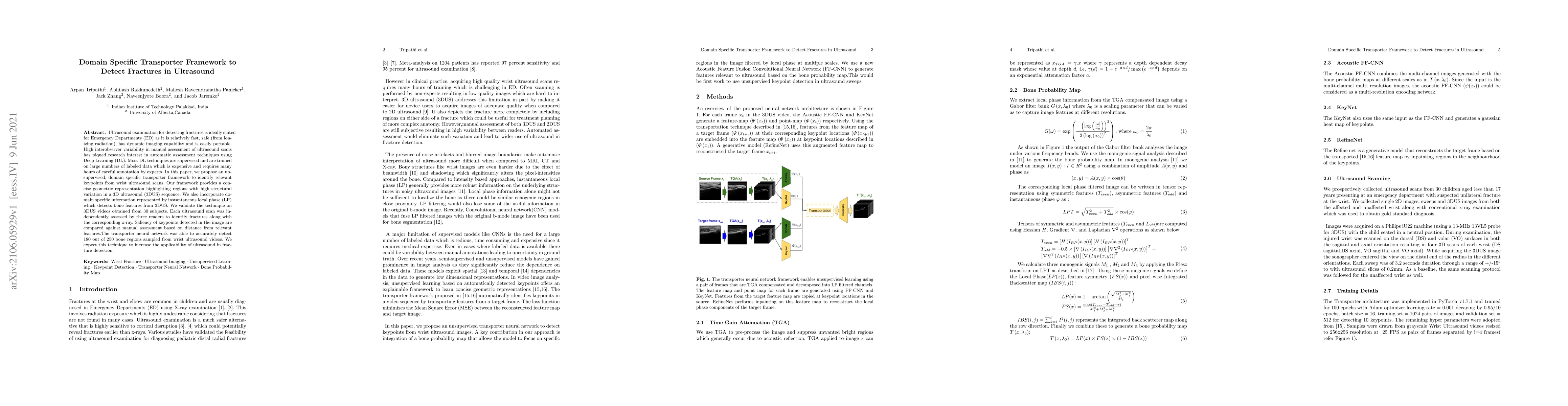 Ultrasound examination for detecting fractures is ideally suited for Emergency Departments (ED) as it is relatively fast, safe (from ionizing radiation), has dynamic imaging capability and is easily portable. High interobserver variability in manual assessment of ultrasound scans has piqued research interest in automatic assessment techniques using Deep Learning (DL). Most DL techniques are supervised and are trained on large numbers of labeled data which is expensive and requires many hours of careful annotation by experts. In this paper, we propose an unsupervised, domain specific transporter framework to identify relevant keypoints from wrist ultrasound scans. Our framework provides a concise geometric representation highlighting regions with high structural variation in a 3D ultrasound (3DUS) sequence. We also incorporate domain specific information represented by instantaneous local phase (LP) which detects bone features from 3DUS. We validate the technique on 3DUS videos obtained from 30 subjects. Each ultrasound scan was independently assessed by three readers to identify fractures along with the corresponding x-ray. Saliency of keypoints detected in the image\ are compared against manual assessment based on distance from relevant features.The transporter neural network was able to accurately detect 180 out of 250 bone regions sampled from wrist ultrasound videos. We expect this technique to increase the applicability of ultrasound in fracture detection.