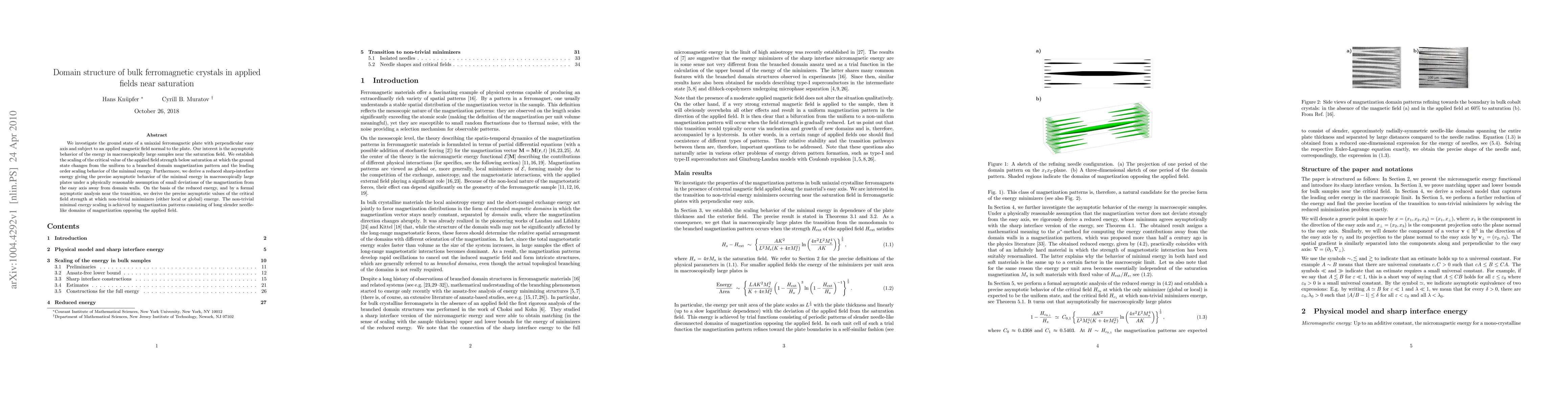 We investigate the ground state of a uniaxial ferromagnetic plate with perpendicular easy axis and subject to an applied magnetic field normal to the plate. Our interest is the asymptotic behavior of the energy in macroscopically large samples near the saturation field. We establish the scaling of the critical value of the applied field strength below saturation at which the ground state changes from the uniform to a branched domain magnetization pattern and the leading order scaling behavior of the minimal energy. Furthermore, we derive a reduced sharp-interface energy giving the precise asymptotic behavior of the minimal energy in macroscopically large plates under a physically reasonable assumption of small deviations of the magnetization from the easy axis away from domain walls. On the basis of the reduced energy, and by a formal asymptotic analysis near the transition, we derive the precise asymptotic values of the critical field strength at which non-trivial minimizers (either local or global) emerge. The non-trivial minimal energy scaling is achieved by magnetization patterns consisting of long slender needle-like domains of magnetization opposing the applied field