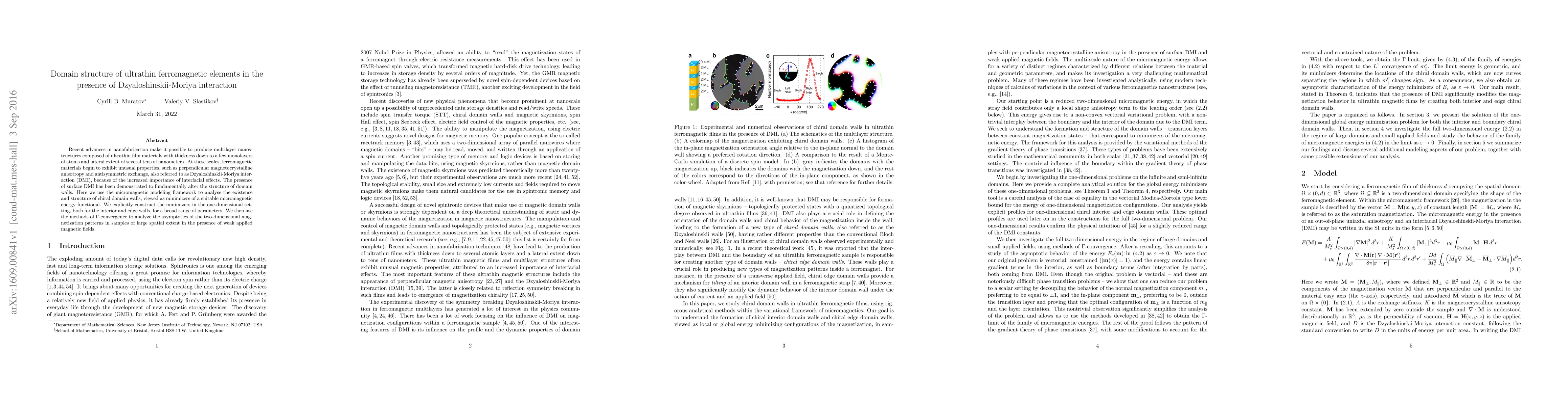 This paper investigates the domain structure of ultrathin ferromagnetic elements influenced by Dzyaloshinskii-Moriya interaction, employing micromagnetic modeling to analyze chiral domain walls and their formation under various parameters. The study uses {$\Gamma$}-convergence methods to examine the magnetization patterns in large samples with weak applied fields.