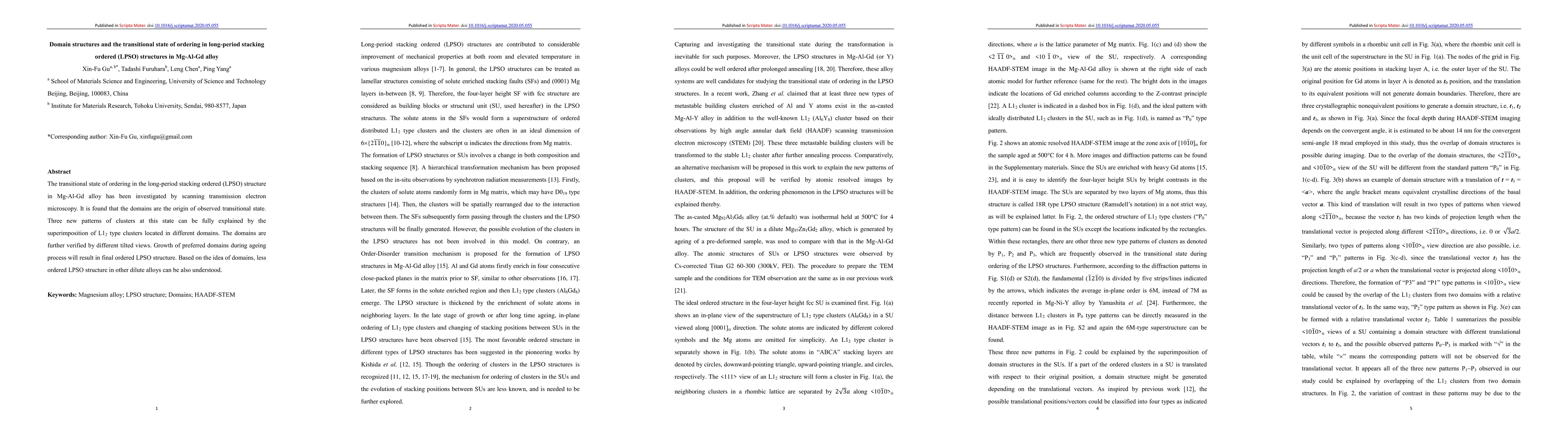 This paper investigates the transitional state of ordering in Mg-Al-Gd alloy's long-period stacking ordered (LPSO) structures using scanning transmission electron microscopy, revealing that domains are the origin of the transitional state. The study identifies three new cluster patterns explained by superimposition of L12 type clusters in different domains, and concludes that domain growth during aging leads to the final ordered LPSO structure.