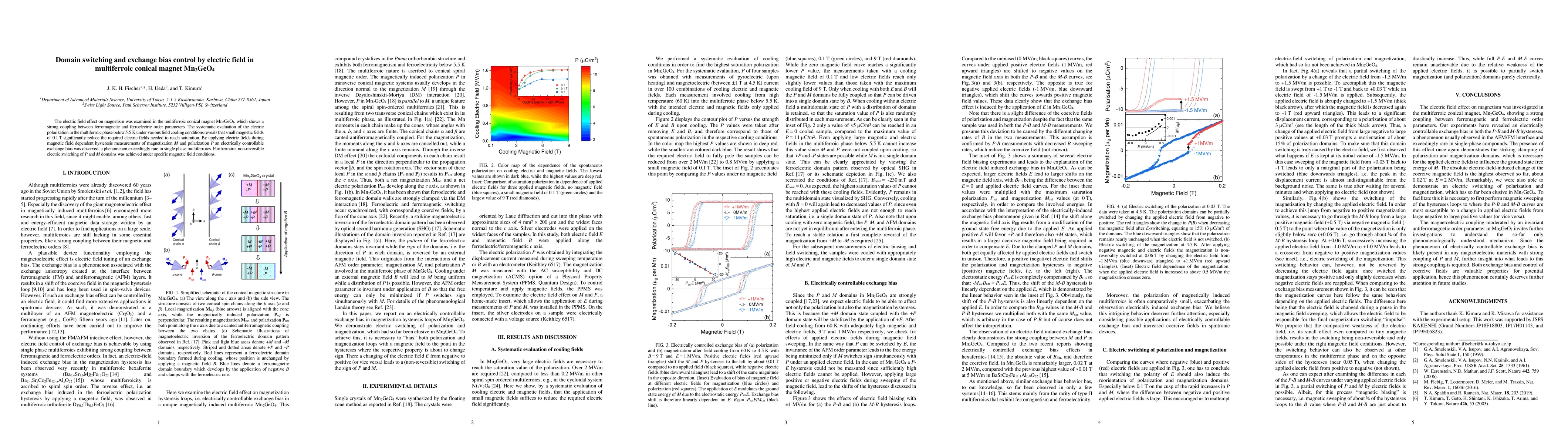 This paper investigates the electric field effect on magnetism in the multiferroic conical magnet Mn$_2$GeO$_4$, demonstrating that small magnetic fields can significantly reduce the electric fields needed to saturate polarization. It reveals an electrically controllable exchange bias and non-reversible switching of magnetization and polarization domains under specific magnetic field conditions.