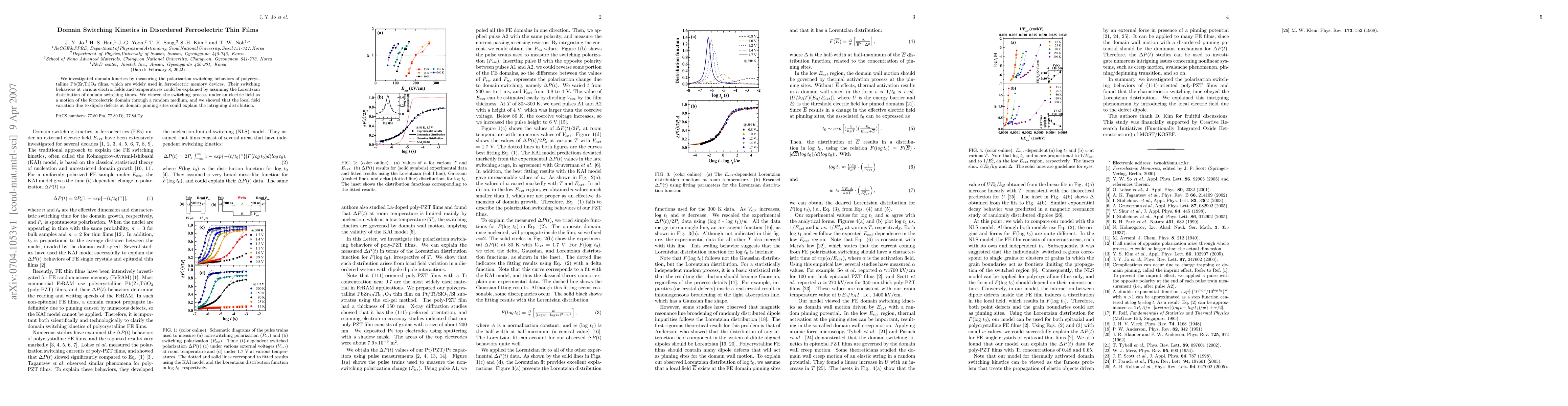 This study examines the domain switching kinetics in polycrystalline Pb(Zr,Ti)O$_3$ thin films, revealing that polarization switching behaviors follow a Lorentzian distribution of switching times, which can be attributed to the local field variations caused by dipole defects at domain pinning sites. The findings provide insights into the motion of ferroelectric domains under an electric field in disordered systems.