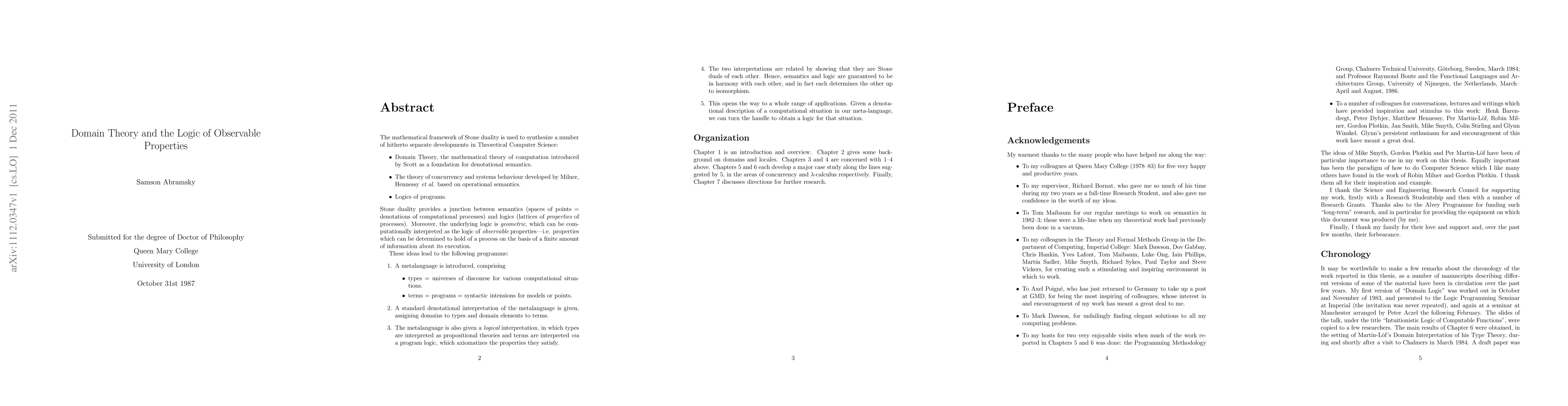 The mathematical framework of Stone duality is used to synthesize a number of hitherto separate developments in Theoretical Computer Science: - Domain Theory, the mathematical theory of computation introduced by Scott as a foundation for denotational semantics. - The theory of concurrency and systems behaviour developed by Milner, Hennessy et al. based on operational semantics. - Logics of programs. Stone duality provides a junction between semantics (spaces of points = denotations of computational processes) and logics (lattices of properties of processes). Moreover, the underlying logic is geometric, which can be computationally interpreted as the logic of observable properties---i.e. properties which can be determined to hold of a process on the basis of a finite amount of information about its execution. These ideas lead to the following programme: 1. A metalanguage is introduced, comprising - types = universes of discourse for various computational situations. - terms = programs = syntactic intensions for models or points. 2. A standard denotational interpretation of the metalanguage is given, assigning domains to types and domain elements to terms. 3. The metalanguage is also given a {\em logical} interpretation, in which types are interpreted as propositional theories and terms are interpreted via a program logic, which axiomatizes the properties they satisfy. 4. The two interpretations are related by showing that they are Stone duals of each other. Hence, semantics and logic are guaranteed to be in harmony with each other, and in fact each determines the other up to isomorphism. This opens the way to a whole range of applications. Given a denotational description of a computational situation in our meta-language, we can turn the handle to obtain a logic for that situation.