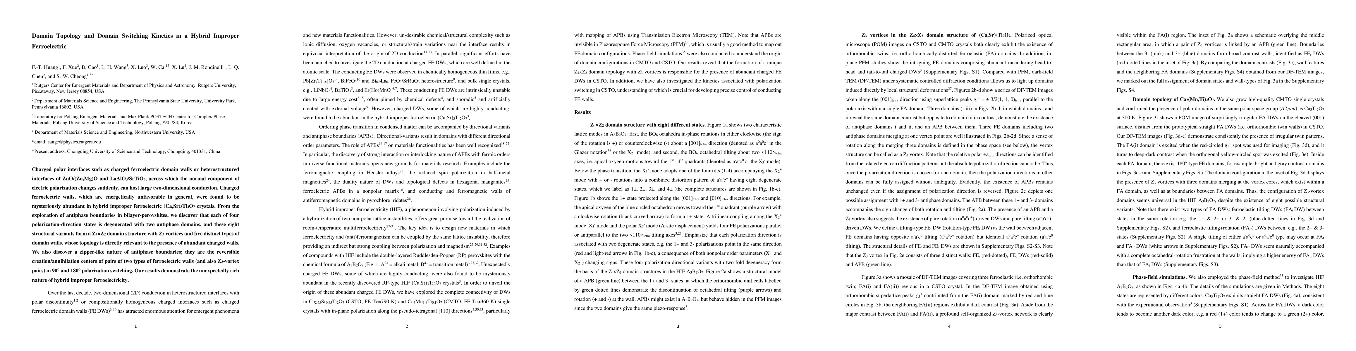 This paper explores the domain topology and switching kinetics in hybrid improper ferroelectric crystals, revealing a complex Z4xZ2 domain structure with abundant charged domain walls and a zipper-like nature of antiphase boundaries facilitating reversible domain switching.