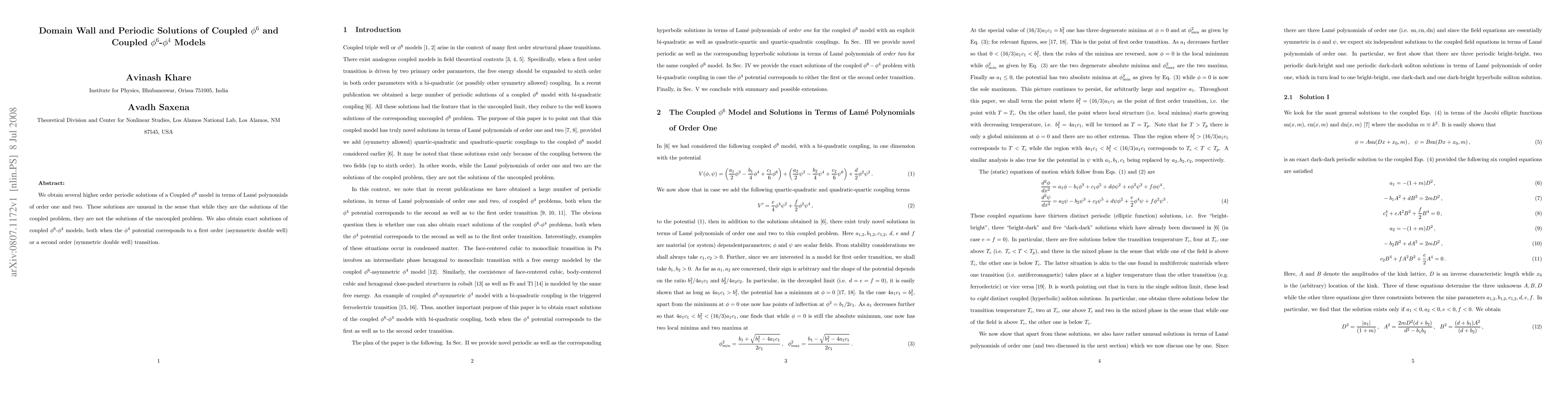 We obtain several higher order periodic solutions of a Coupled phi6 model in terms of Lame polynomials of order one and two. These solutions are unusual in the sense that while they are the solutions of the coupled problem, they are not the solutions of the uncoupled problem. We also obtain exact solutions of coupled phi6-phi4 models, both when the phi4 potential corresponds to a first order (asymmetric double well) or a second order (symmetric double well) transition.