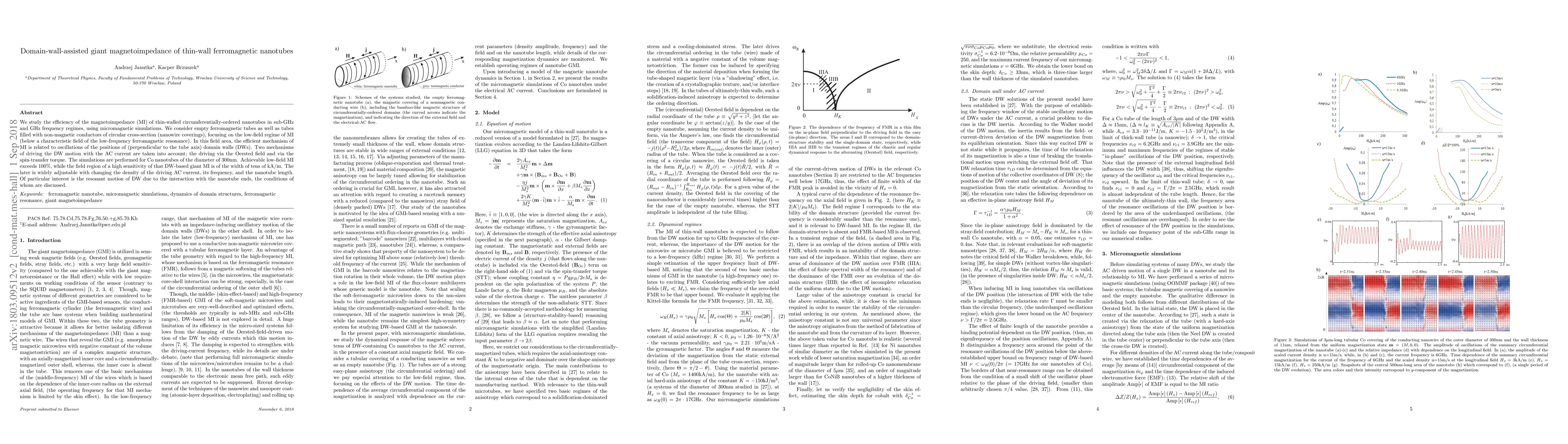 This study explores the domain-wall-assisted giant magnetoimpedance in thin-wall ferromagnetic nanotubes, revealing that low-field MI efficiency can exceed 100% due to domain wall oscillations driven by ac current via Oersted field and spin-transfer torque. The sensitivity and width of the high MI region are adjustable through parameters like ac current density, frequency, and nanotube length.