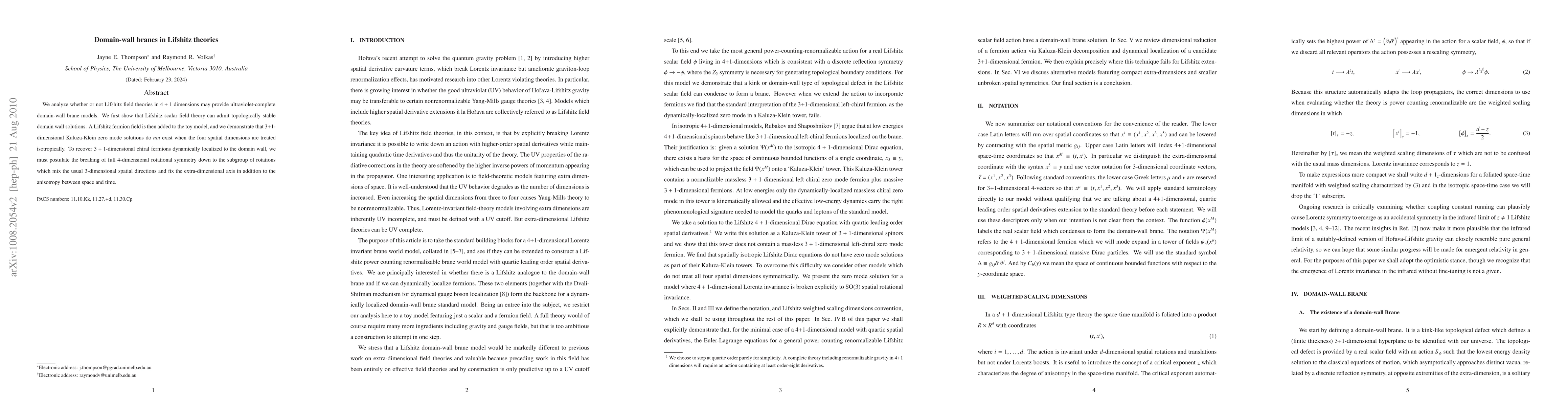 We analyze whether or not Lifshitz field theories in 4 + 1 dimensions may provide ultraviolet-complete domain-wall brane models. We first show that Lifshitz scalar field theory can admit topologically stable domain wall solutions. A Lifshitz fermion field is then added to the toy model, and we demonstrate that 3+1- dimensional Kaluza-Klein zero mode solutions do not exist when the four spatial dimensions are treated isotropically. To recover 3 + 1-dimensional chiral fermions dynamically localized to the domain wall, we must postulate the breaking of full 4-dimensional rotational symmetry down to the subgroup of rotations which mix the usual 3-dimensional spatial directions and fix the extra-dimensional axis in addition to the anisotropy between space and time.