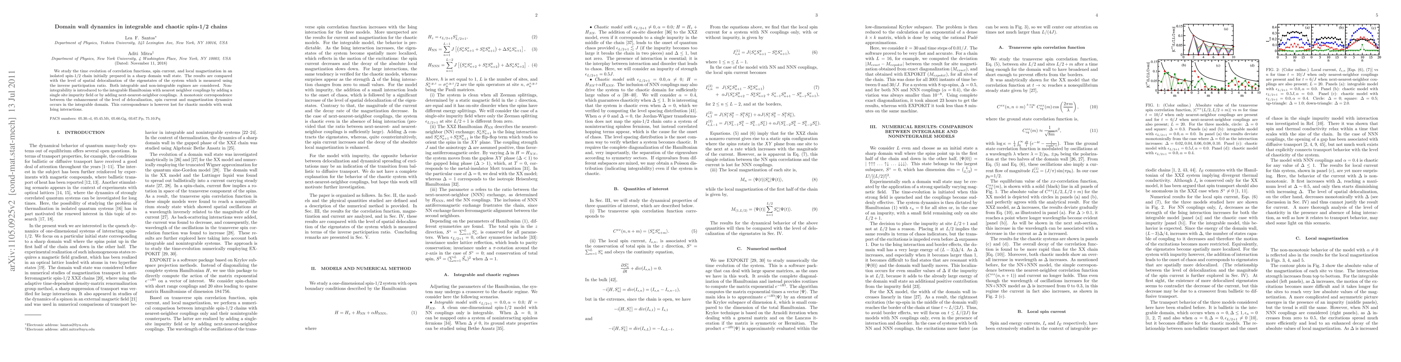 This paper investigates the dynamics of domain walls in spin-1/2 chains, comparing integrable and chaotic systems. It finds a monotonic relationship between delocalization, spin current, and magnetization in integrable systems, but this relationship breaks down in chaotic models with weak Ising interactions.