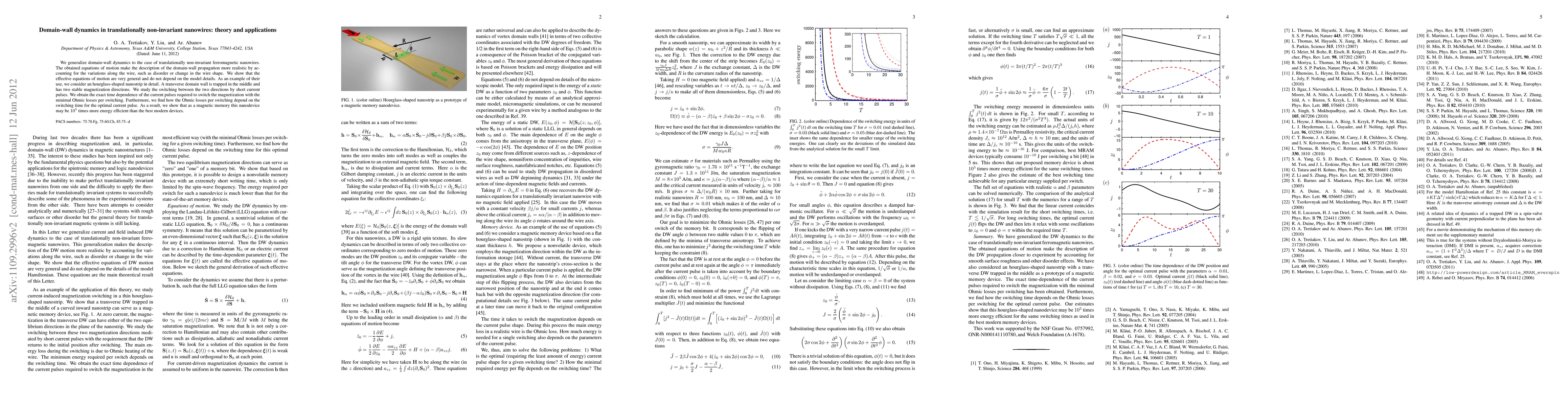 We generalize domain-wall dynamics to the case of translationally noninvariant ferromagnetic nanowires. The obtained equations of motion make the description of the domain-wall propagation more realistic by accounting for the variations along the wire, such as disorder or change in the wire shape. We show that the effective equations of motion are very general and do not depend on the model details. As an example of their use, we consider an hourglass-shaped nanostrip in detail. A transverse domain wall is trapped in the middle and has two stable magnetization directions. We study the switching between the two directions by short current pulses. We obtain the exact time dependence of the current pulses required to switch the magnetization with the minimal Ohmic losses per switching. Furthermore, we find how the Ohmic losses per switching depend on the switching time for the optimal current pulse. As a result, we show that as a magnetic memory this nanodevice can be $10^5$ times more energy efficient than the best modern devices.