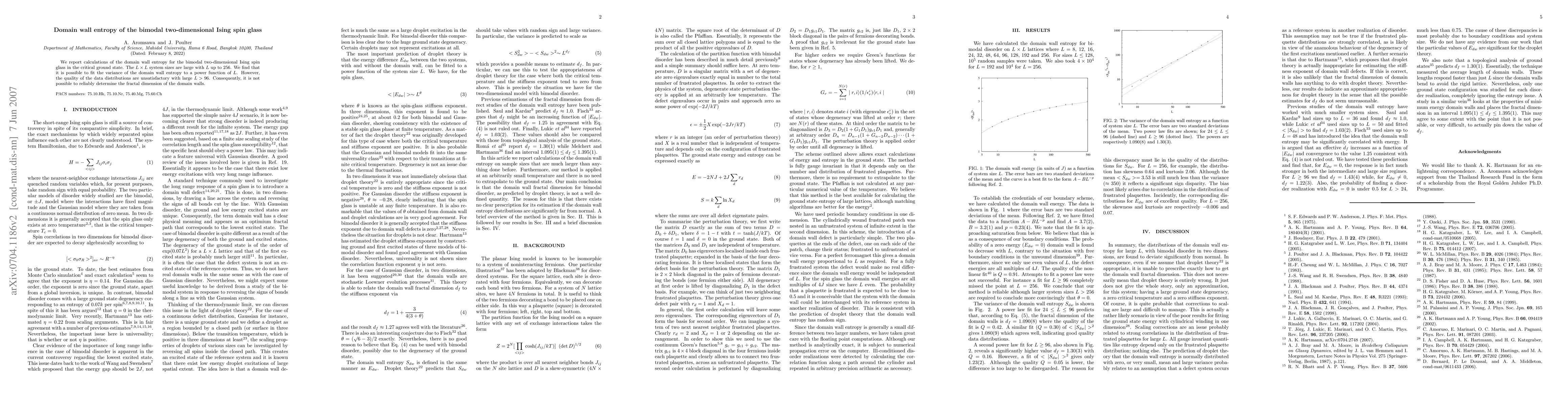 This study calculates the domain wall entropy for a bimodal two-dimensional Ising spin glass in its critical ground state, finding a power-law fit for variance with system size L, but data quality deteriorates for L > 96, preventing reliable determination of the fractal dimension.