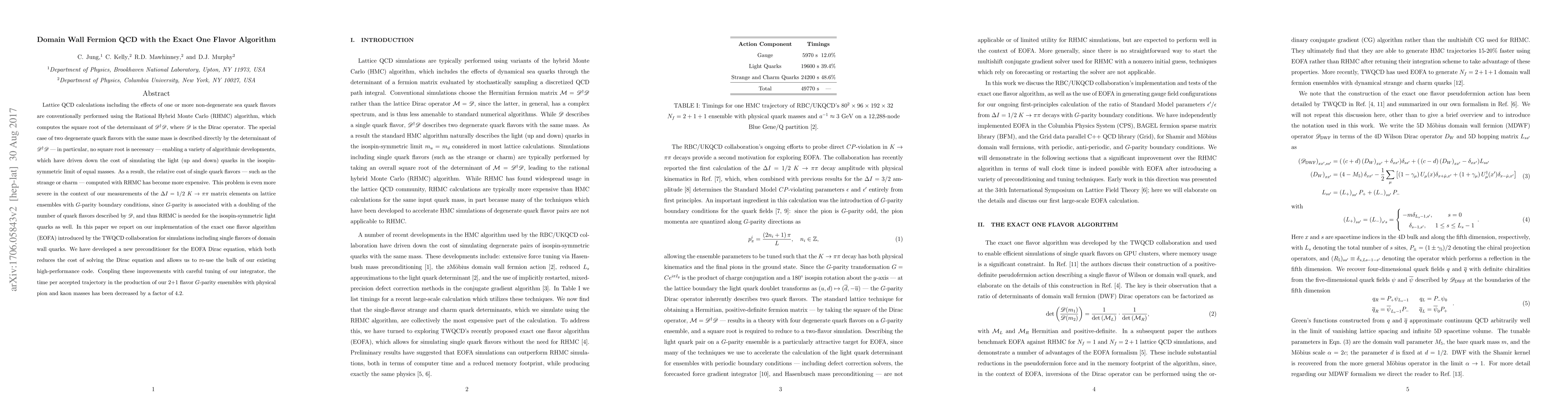 Lattice QCD calculations including the effects of one or more non-degenerate sea quark flavors are conventionally performed using the Rational Hybrid Monte Carlo (RHMC) algorithm, which computes the square root of the determinant of $\mathscr{D}^{\dagger} \mathscr{D}$, where $\mathscr{D}$ is the Dirac operator. The special case of two degenerate quark flavors with the same mass is described directly by the determinant of $\mathscr{D}^{\dagger} \mathscr{D}$ --- in particular, no square root is necessary --- enabling a variety of algorithmic developments, which have driven down the cost of simulating the light (up and down) quarks in the isospin-symmetric limit of equal masses. As a result, the relative cost of single quark flavors --- such as the strange or charm --- computed with RHMC has become more expensive. This problem is even more severe in the context of our measurements of the $\Delta I = 1/2$ $K \rightarrow \pi \pi$ matrix elements on lattice ensembles with $G$-parity boundary conditions, since $G$-parity is associated with a doubling of the number of quark flavors described by $\mathscr{D}$, and thus RHMC is needed for the isospin-symmetric light quarks as well. In this paper we report on our implementation of the exact one flavor algorithm (EOFA) introduced by the TWQCD collaboration for simulations including single flavors of domain wall quarks. We have developed a new preconditioner for the EOFA Dirac equation, which both reduces the cost of solving the Dirac equation and allows us to re-use the bulk of our existing high-performance code. Coupling these improvements with careful tuning of our integrator, the time per accepted trajectory in the production of our 2+1 flavor $G$-parity ensembles with physical pion and kaon masses has been decreased by a factor of 4.2.