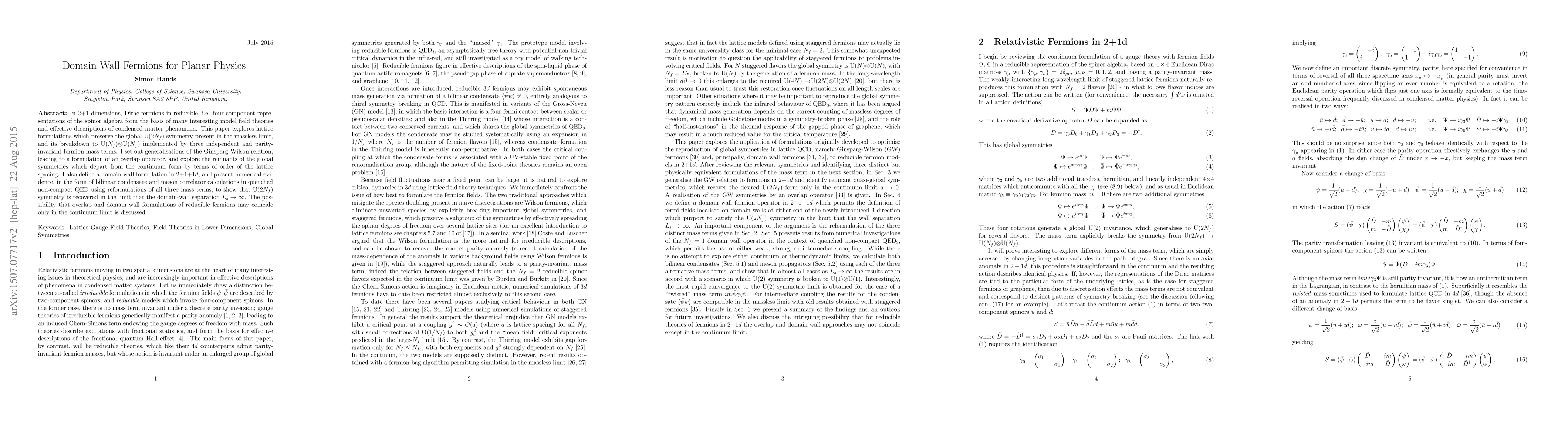 Researchers explore lattice formulations of Dirac fermions that preserve a key symmetry in 2+1 dimensions, finding evidence of recovered symmetry at large domain-wall separations. The study suggests overlap and domain wall formulations may coincide only in the continuum limit.