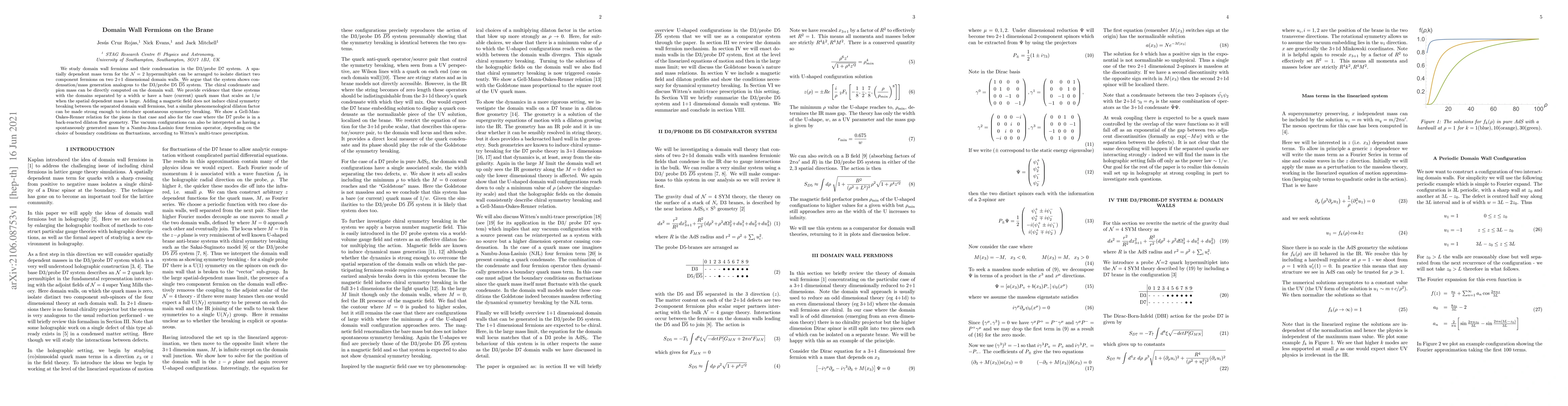 We study domain wall fermions and their condensation in the D3/probe D7 system. A spatially dependent mass term for the N=2 hypermultiplet can be arranged to isolate distinct two component fermions on two 2+1 dimensional domain walls. We argue that the system shows condensation/mass generation analogous to the D3/probe D5 anti-D5 system. The chiral condensate and pion mass can be directly computed on the domain wall. We provide evidence that these systems with the domains separated by a width w have a bare (current) quark mass that scales as 1/w when the spatial dependent mass is large. Adding a magnetic field does not induce chiral symmetry breaking between the separated domain wall fermions, but a similar phenomenological dilaton factor can be made strong enough to introduce spontaneous symmetry breaking. We show a Gell-Man-Oakes-Renner relation for the pions in that case and also for the case where the D7 probe is in a back-reacted dilaton flow geometry. The vacuum configurations can also be interpreted as having a spontaneously generated mass by a Nambu-Jona-Lasinio four fermion operator, depending on the choice of boundary conditions on fluctuations, according to Witten's multi-trace prescription.