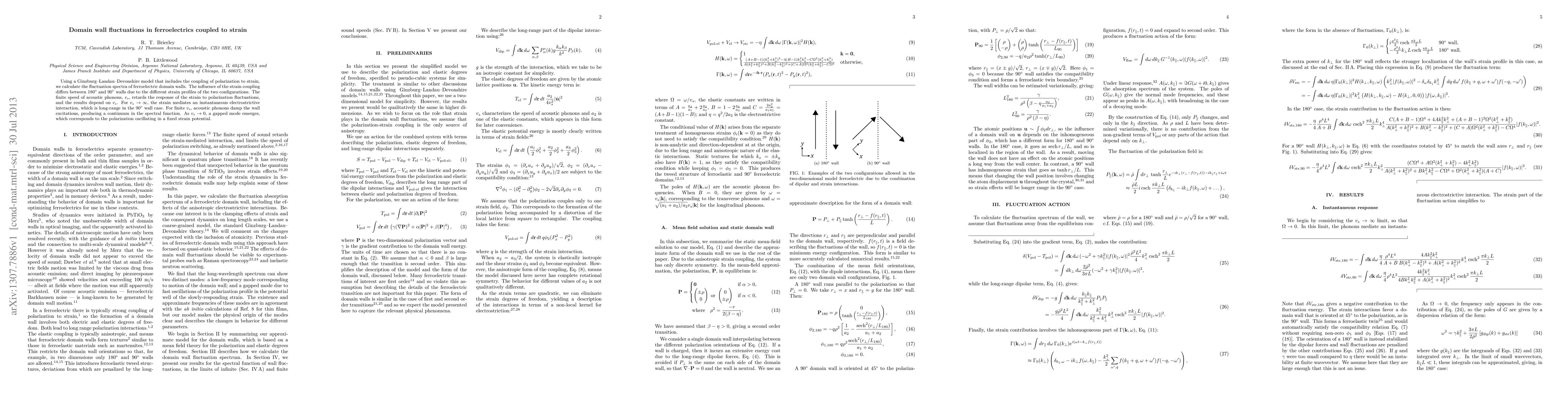 Using a Ginzburg--Landau--Devonshire model that includes the coupling of polarization to strain, we calculate the fluctuation spectra of ferroelectric domain walls. The influence of the strain coupling differs between 180 degree and 90 degree walls due to the different strain profiles of the two configurations. The finite speed of acoustic phonons, $v_s$, retards the response of the strain to polarization fluctuations, and the results depend on $v_s$. For $v_s \to \infty$, the strain mediates an instantaneous electrostrictive interaction, which is long-range in the 90 degree wall case. For finite $v_s$, acoustic phonons damp the wall excitations, producing a continuum in the spectral function. As $v_s\ to 0$, a gapped mode emerges, which corresponds to the polarization oscillating in a fixed strain potential.