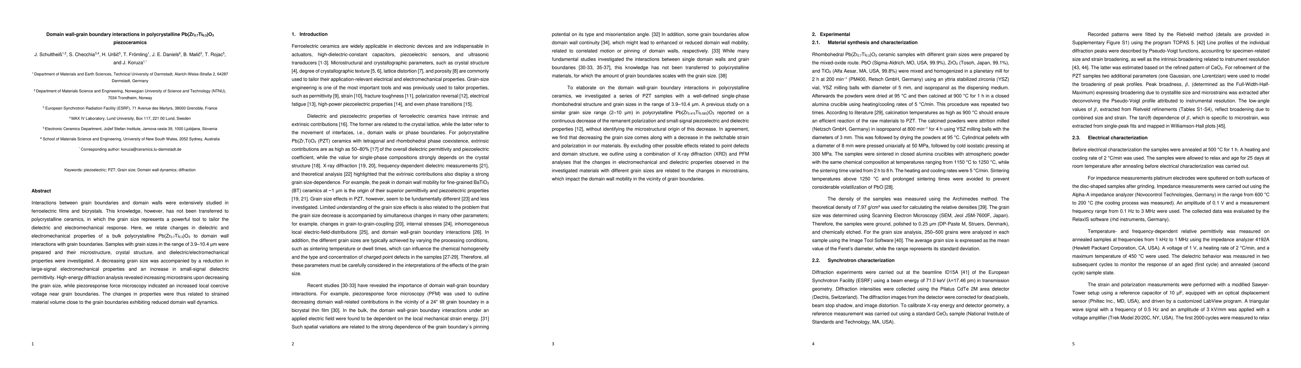 This study investigates the impact of domain wall-grain boundary interactions on the dielectric and electromechanical properties of polycrystalline Pb(Zr0.7Ti0.3)O3 piezoceramics. Smaller grain sizes led to reduced large-signal electromechanical properties and increased small-signal dielectric permittivity, attributed to constrained domain wall dynamics near grain boundaries.