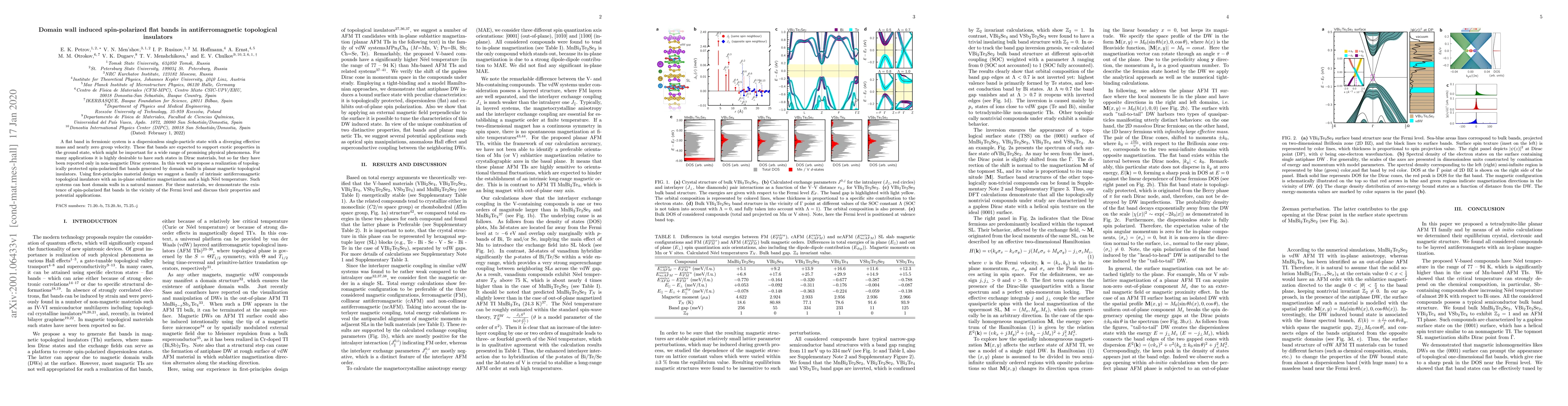 A flat band in fermionic system is a dispersionless single-particle state with a diverging effective mass and nearly zero group velocity. These flat bands are expected to support exotic properties in the ground state, which might be important for a wide range of promising physical phenomena. For many applications it is highly desirable to have such states in Dirac materials, but so far they have been reported only in non-magnetic Dirac systems. In this work we propose a realization of topologically protected spin-polarized flat bands generated by domain walls in planar magnetic topological insulators. Using first-principles material design we suggest a family of intrinsic antiferromagnetic topological insulators with an in-plane sublattice magnetization and a high N\'eel temperature. Such systems can host domain walls in a natural manner. For these materials, we demonstrate the existence of spin-polarized flat bands in the vicinity of the Fermi level and discuss their properties and potential applications.