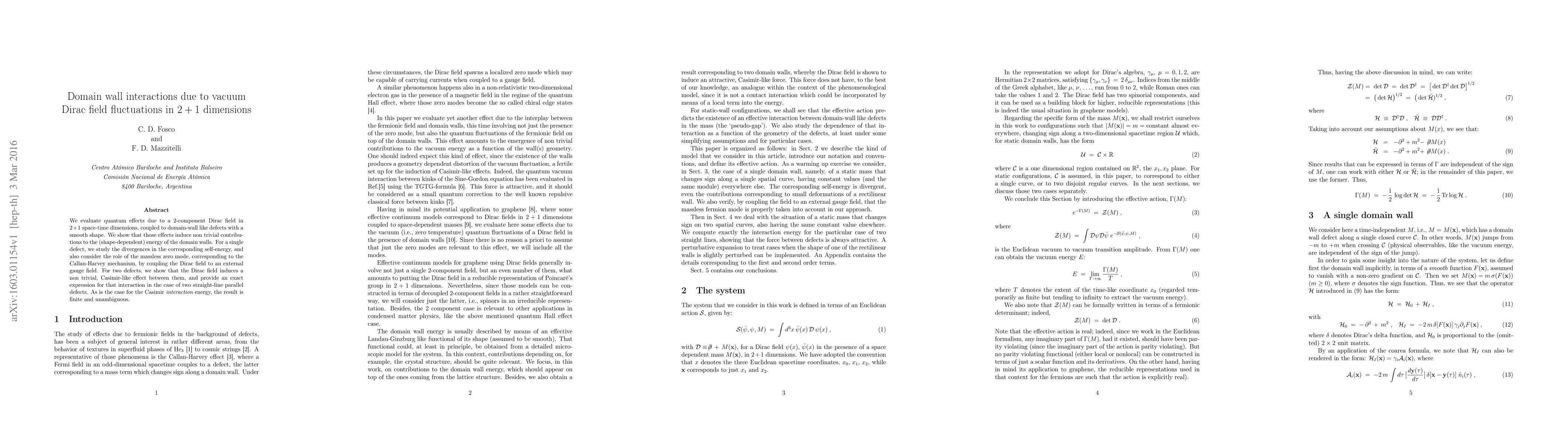 We evaluate quantum effects due to a $2$-component Dirac field in $2+1$ space-time dimensions, coupled to domain-wall like defects with a smooth shape. We show that those effects induce non trivial contributions to the (shape-dependent) energy of the domain walls. For a single defect, we study the divergences in the corresponding self-energy, and also consider the role of the massless zero mode, corresponding to the Callan-Harvey mechanism, by coupling the Dirac field to an external gauge field. For two defects, we show that the Dirac field induces a non trivial, Casimir-like effect between them, and provide an exact expression for that interaction in the case of two straight-line parallel defects. As is the case for the Casimir interaction energy, the result is finite and unambiguous.