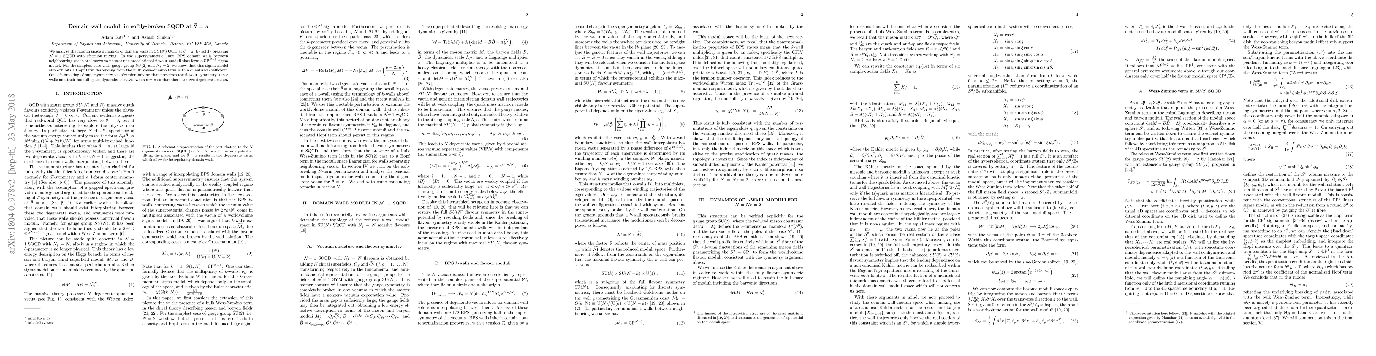 We analyze the moduli space dynamics of domain walls in $SU(N)$ QCD at $\bar\theta=\pi$, by softly breaking ${\cal N}\! =\!1$ SQCD with sfermion mixing. In the supersymmetric limit, BPS domain walls between neighbouring vacua are known to possess non-translational flavour moduli that form a $\mathcal{C} P^{N-1}$ sigma model. For the simplest case with gauge group $SU(2)$ and $N_f=2$, we show that this sigma model also exhibits a Hopf term descending from the bulk Wess-Zumino term with a quantized coefficient. On soft-breaking of supersymmetry via sfermion mixing that preserves the flavour symmetry, these walls and their moduli-space dynamics survives when $\bar\theta=\pi$ so that there are two degenerate vacua.