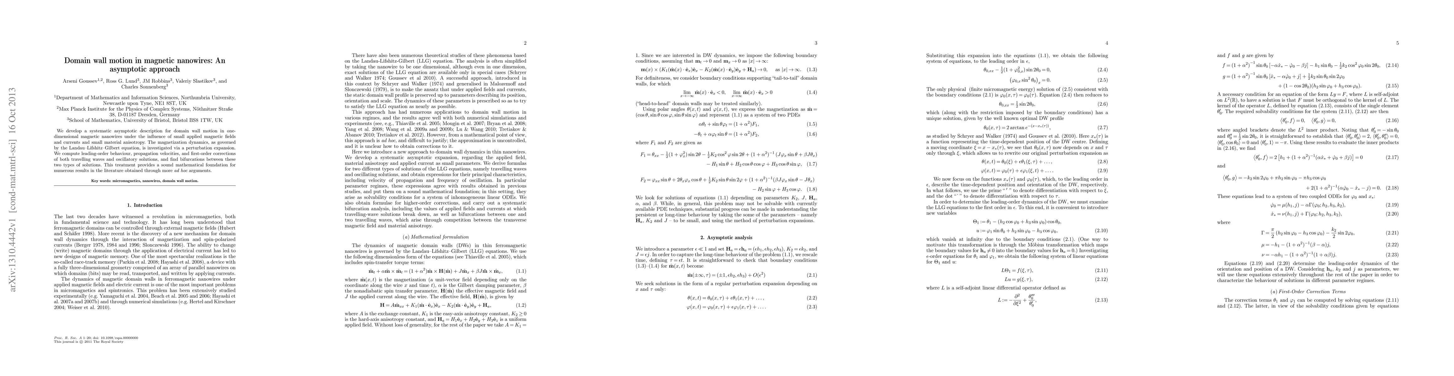 Researchers developed an asymptotic approach to describe domain wall motion in magnetic nanowires under small applied fields and currents, revealing bifurcations between travelling waves and oscillatory solutions.