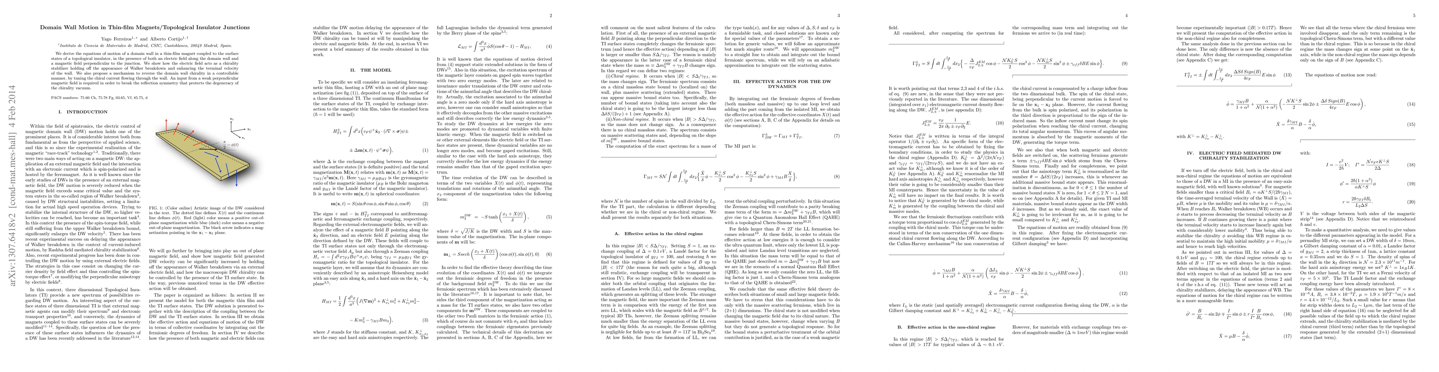 This paper derives the equations of motion for a Domain Wall in a thin-film magnet coupled to a Topological Insulator, demonstrating that an electric field can stabilize chirality and enhance terminal velocity, while a weak perpendicular magnetic field is needed to reverse the Domain Wall chirality by breaking symmetry.