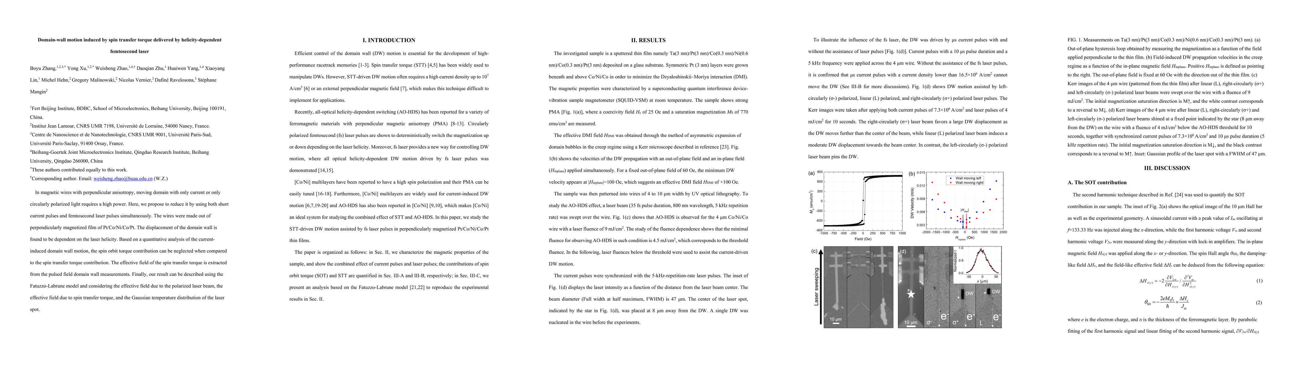 Summary: This study proposes a method to reduce the high power required for domain-wall motion in magnetic wires by combining short current pulses with helicity-dependent femtosecond laser pulses. The results show that spin transfer torque dominates over spin orbit torque, and the domain-wall displacement is influenced by the laser helicity, modeled effectively using the Fatuzzo-Labrune model.